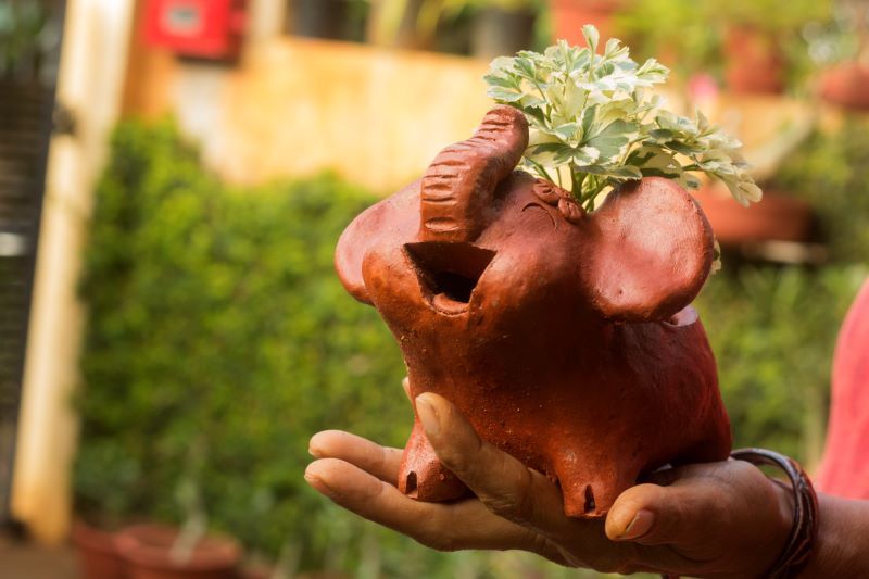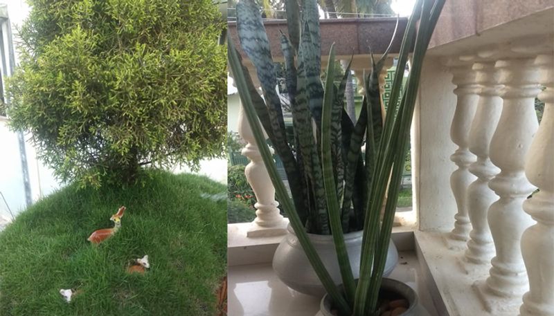 പൊട്ടിപ്പോയ ചട്ടികള് മാത്രം പ്രത്യേക രീതിയില് ചേര്ത്തുവെച്ച് മണ്ണ് നിറച്ച് ചെടികള് വളര്ത്തിയിരിക്കുന്നതും കൗതുകമാണ്. ഓരോ ചെറിയ പ്ലാസ്റ്റിക് കപ്പുകളിലും മണ്ണ് നിറച്ച് ചെടികള് വളര്ത്തി വിവിധ വര്ണങ്ങളിലുള്ള കല്ലുകളും ചെറിയ ചെറിയ മൃഗങ്ങളുടെ രൂപങ്ങളും ചേര്ത്തുവെച്ചിരിക്കുന്നു. ചെടി നടാനുപയോഗിക്കുന്ന പാത്രങ്ങളുടെ പുറത്ത് കക്കകള് ഒട്ടിച്ചുവെച്ചിരിക്കുന്നതും ഭംഗിയുള്ള കാഴ്ച തന്നെ.
