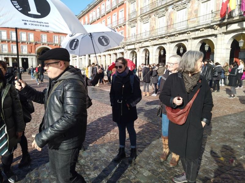 പ്ലാസ മേയർ എന്ന ഒരു ചത്വരത്തിന്റെ ഒത്ത നടുവിൽ ഗൈഡ് മുൻനിശ്ചയ പ്രകാരം കുടയും പിടിച്ചു സ്ഥാനം പിടിച്ചിട്ടുണ്ട്. മാഡ്രിഡ് നഗരത്തിന്റെ ഹിസ്റ്ററിയും ജോഗ്രഫിയും ഒക്കെ അരച്ചു കലക്കി കുടിച്ചിട്ടാണ് ഗൈഡിന്റെ വരവ്. അടുത്ത മൂന്ന് മണിക്കൂർ മാഡ്രിഡ് നഗരത്തെ പറ്റി ഗൈഡ് നമുക്ക് ഇഷ്ടപ്പെടുന്ന രീതിയിൽ തള്ളി മറിക്കും. എന്നെ കൂടാതെ രണ്ടു ഡച്ചുകാരും ഒരു അമേരിക്കൻ യുവതിയും പിന്നെ ഒരു കാനഡക്കാരനും ആണ് ടൂർ അംഗങ്ങൾ.