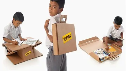 മിക്കവാറും ഈ കുഞ്ഞുങ്ങളെല്ലാം നിലത്തിരുന്ന് പുസ്തകം നിലത്തുവെച്ചാണ് എഴുതുന്നത്. മണിക്കൂറുകള് നീണ്ട ഈ കുനിഞ്ഞുള്ള ഇരിപ്പ് പലതരത്തിലുള്ള ആരോഗ്യപ്രശ്നങ്ങളുമുണ്ടാക്കും. പക്ഷെ, പല സ്കൂളുകളിലും കുട്ടികള്ക്ക് ബെഞ്ചോ ഡെസ്കോ നല്കാനുള്ള ഫണ്ടില്ല എന്നതാണ് വാസ്തവം. അങ്ങനെയാണ് സ്കൂളിന് ചെലവ് വരാത്ത രീതിയില് കുറഞ്ഞ വിലയ്ക്ക് ഇങ്ങനെയൊരു സാധ്യത കണ്ടെത്തുന്നത്. അതായത്, ഡെസ്കിന്റെ രൂപത്തിലേക്ക് മാറ്റാന് കഴിയുന്ന ബാഗ്. കാര്ഡ്ബോര്ഡുപയോഗിച്ചാണ് ഇവ നിര്മ്മിച്ചിരിക്കുന്നത്. ഹെല്പ് ഡെസ്ക് എന്നാണ് ഇതിനെ വിളിക്കുന്നത്. 10-12 രൂപ വരെയാണ് വിലയെങ്കിലും ചിലയിടങ്ങളില് സൗജന്യമായും ഇവയെത്തിക്കുന്നു. 50 സെന്റിമീറ്റര് ഉയരത്തില് വച്ചെഴുതാമെന്നത് കുഞ്ഞുങ്ങളുടെ ഇരിപ്പ് ആയാസരഹിതമാക്കി.