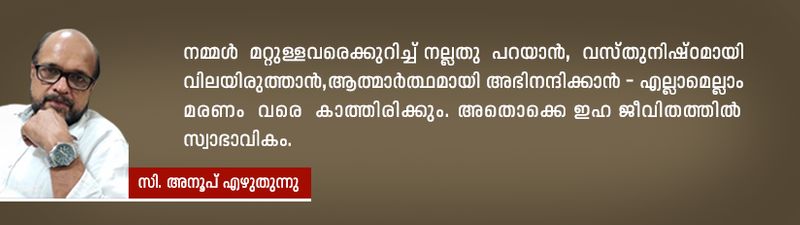നമ്മൾ മറ്റുള്ളവരെക്കുറിച്ച് നല്ലതു പറയാൻ, വസ്തുനിഷ്ഠമായി വിലയിരുത്താൻ, ആത്മാർത്ഥമായി അഭിനന്ദിക്കാൻ -എല്ലാമെല്ലാം മരണം വരെ കാത്തിരിക്കും. അതൊക്കെ ഇഹ ജീവിതത്തിൽ സ്വാഭാവികം. എങ്കിലും ടി. എൻ.ജി ജീവിച്ചിരുന്നപ്പോൾ വന്ന ഉണ്ണിയുടെ ലേഖനം. അത് നൽകിയ സന്തോഷം കണ്ടപ്പോൾ തോന്നി നമ്മൾ ജീവിച്ചിരിക്കുമ്പോഴാണ് പരസ്പരം സ്നേഹത്തിൻ്റെ ഇടനിലം തീർക്കേണ്ടതെന്ന്. മരണാനന്തര കർമ്മങ്ങളെക്കാൾ വില ജീവിച്ചിരിക്കുമ്പോഴുള്ള ഒരു പുഞ്ചിരിക്കാണ്. ഒരു ചുമലിൽ തട്ടിനാണ്. ടി.എൻ.ജി ആ രോഗത്തിൽ നിന്ന് മുക്തനായില്ല. പതുക്കെപ്പതുക്കെ മരണത്തിൻ്റെ കൈ ടി.എൻ.ജി -യെ അമർത്തി നിശ്ശബ്ദാക്കി.
