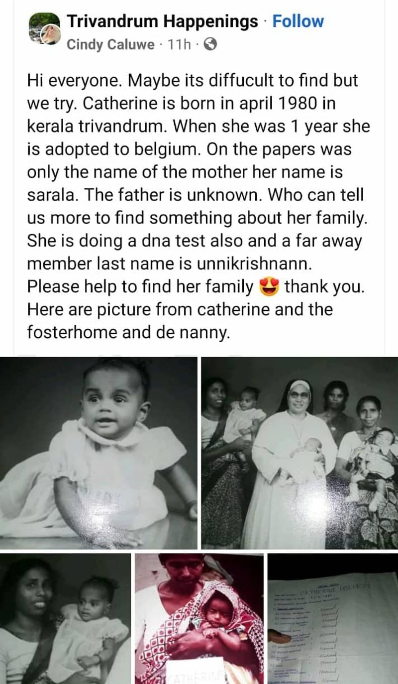 സിൻഡി എഴുതിയിരിക്കുന്നത് ഇങ്ങനെ: ഇത് ചിലപ്പോൾ ബുദ്ധിമുട്ടായിരിക്കാം. എങ്കിലും നാം ശ്രമിക്കാതിരിക്കരുതല്ലോ. കാതറിൻ ജനിച്ചത് 1980 -ൽ കേരളത്തിലെ തിരുവനന്തപുരത്താണ്. ഒരു വയസുള്ളപ്പോൾ അവളെ ദത്തെടുക്കുകയും അവൾ ബെൽജിയത്തിലെത്തുകയും ചെയ്തു. അവളുടെ പേപ്പറുകളിൽ ആകെയുള്ള കുടുംബത്തെ കുറിച്ചുള്ള വിവരം അവളുടെ അമ്മയുടെ പേര് സരള എന്നാണ് എന്നുമാത്രമാണ്. ആരാണ് അവളുടെ അച്ഛനെന്നതിനെ കുറിച്ചുള്ള വിവരങ്ങളൊന്നും അതിലില്ല. അവളുടെ കുടുംബത്തെ കുറിച്ചുള്ള എന്തെങ്കിലും വിവരം ആർക്കെങ്കിലും തന്ന് നമ്മെ സഹായിക്കാനാകുമോ? കാതറിൻ ഒരു ഡിഎൻഎ ടെസ്റ്റും നടത്തിയിട്ടുണ്ട്. അതിൽ വളരെ വളരെ അകന്ന ഒരു ബന്ധത്തിൽ ഒരു ഉണ്ണികൃഷ്ണൻ ഉണ്ട് എന്ന് കണ്ടെത്തുകയുണ്ടായി. കാതറിന്റെ കുടുംബത്തെ സഹായിക്കാൻ ആരെങ്കിലും സഹായിക്കുമോ? കാതറിന്റെയും അവളുണ്ടായിരുന്ന അനാഥാലയത്തിന്റെയും നാനിയുടെയും ചിത്രവും കൂടി ഇതോടൊപ്പം വയ്ക്കുന്നു.