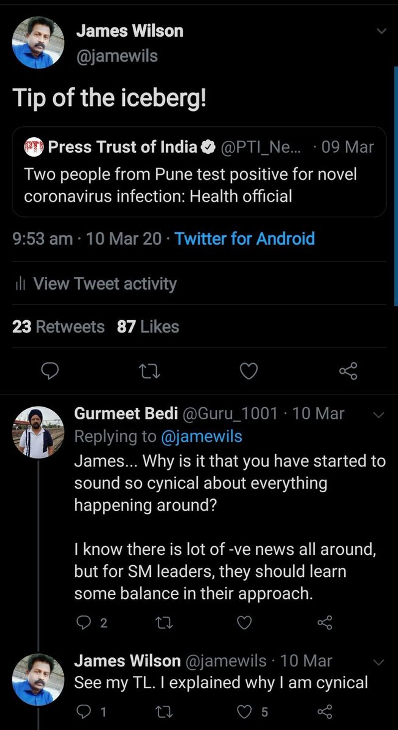 അതിനു ചുവടെ പലരും വന്നു അദ്ദേഹത്തെ 'ദോഷൈകദൃക്ക്' എന്നും 'നെഗറ്റിവിറ്റി പരത്തുന്ന' ആളെന്നും ഒക്കെ വിളിക്കയുണ്ടായി അന്ന്. പക്ഷേ, തന്റെ ട്വീറ്റിന് നീതീകരണമായി പറഞ്ഞത്, കഴിഞ്ഞ കുറെ ദിവസത്തെ മറ്റു ട്വീറ്റുകൾ പരിശോധിക്കാൻ മാത്രമാണ്. കാരണം, ജനുവരി 30 -ന് ചൈനയിലെ വുഹാനിൽ നിന്ന് തിരിച്ചു വന്ന രണ്ട് മലയാളി മെഡിക്കൽ വിദ്യാർഥികളിലൂടെ ആദ്യമായി ഇന്ത്യയിൽ കൊവിഡ് സ്ഥിരീകരിക്കപ്പെട്ട അന്ന് തൊട്ട് ഇന്ത്യയിലെയും, വിശിഷ്യാ കേരളത്തിലെയും രോഗത്തിന്റെ ട്രെൻഡുകളെ വളരെ താത്പര്യത്തോടെ വിശകലനം ചെയ്യുകയും നിരീക്ഷണങ്ങൾ ഇടയ്ക്കിടെ ട്വീറ്റ് ചെയ്യുകയും ചെയ്തിരുന്നു വിൽസൺ. ദിവസങ്ങളും ആഴ്ചകളും ഇടവിട്ട് നടത്തിയ വിശകലനങ്ങളിൽ ട്രെൻഡ് ഏറെ മോശമാണ് എന്ന് തിരിച്ചറിഞ്ഞതിന്റെ വെളിച്ചത്തിലായിരുന്നു വിൽസന്റെ പ്രവചനാത്മകമായ ആ ട്വീറ്റ്.