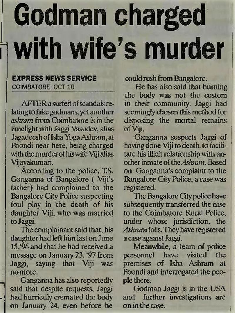1997-ൽ കോയമ്പത്തൂർ ആശ്രമത്തിൽ വെച്ച്, ജഗ്ഗിയുടെ ജീവിതത്തെ പിടിച്ചുലച്ച ഒരു സംഭവമുണ്ടാകുന്നു. പത്നി വിജയകുമാരിയുടെ മരണം. അവർ മഹാസമാധി അടയുകയായിരുന്നു എന്ന് ജഗ്ഗിയും സംഘവും അവകാശപ്പെടുമ്പോൾ, അതേപ്പറ്റി ലഭ്യമായ ഒരേയൊരു രേഖ അക്കൊല്ലം അച്ചടിച്ചുവന്ന ഇന്ത്യൻ എക്സ്പ്രസ് പത്രത്തിന്റെ ഒരു റിപ്പോർട്ടിന്റെ കട്ടിങ് ആണ്. അത് ജഗ്ഗി എന്ന ആൾദൈവത്തെ നിശിതമായി വിമർശിച്ചുകൊണ്ടുള്ള ഒന്നാണ്. അതിൽ ഗംഗണ്ണാ എന്നുപേരായ ഒരു വൃദ്ധൻ ബാംഗ്ലൂർ സിറ്റി പൊലീസിൽ നൽകിയ ഒരു പരാതിയെപ്പറ്റിയും പറയുന്നുണ്ട്. തന്റെ മകൾ വിജി എന്ന് വിളിക്കുന്ന വിജയകുമാരിയുടെ ദുരൂഹമരണവുമായി ബന്ധപ്പെട്ട് തനിക്ക് തന്റെ മരുമകൻ ജഗ്ഗിയെ സംശയമുണ്ട് എന്നാണ് ആ റിപ്പോർട്ടിൽ ഗംഗണ്ണയെ ഉദ്ധരിച്ചുകൊണ്ട് പറഞ്ഞത്. അദ്ദേഹം എക്സ്പ്രസിനോട് പറഞ്ഞത്, തന്റെ അഭ്യർത്ഥന മാനിക്കാതെ താൻ ബാംഗ്ലൂരിൽ നിന്ന് ഓടിയെത്തുമ്പോഴേക്കും, തന്നെ ഒരു നോക്കുകാണിക്കാതെ തന്നെ തന്റെ മകളുടെ മൃതദേഹം ചിതയിൽ ദഹിപ്പിച്ചു കഴിഞ്ഞിരുന്നു എന്നാണ്. മരുമകൻ ജഗ്ഗി അങ്ങനെ പ്രവർത്തിച്ചത് മരണത്തിൽ അയാൾക്ക് പങ്കുള്ളതുകൊണ്ടാവാം എന്ന സംശയം ഗംഗണ്ണ പ്രകടിപ്പിക്കുന്നു. അങ്ങനെ ചെയ്യാൻ കാരണം, ആശ്രമത്തിലെ മറ്റൊരു യുവതിയുമായുള്ള ജഗ്ഗിയുടെ ബന്ധത്തെ തന്റെ മകൾ ചോദ്യം ചെയ്തതാവാം എന്നും ആ അച്ഛൻ ആരോപിച്ചിരുന്നു അന്ന്.