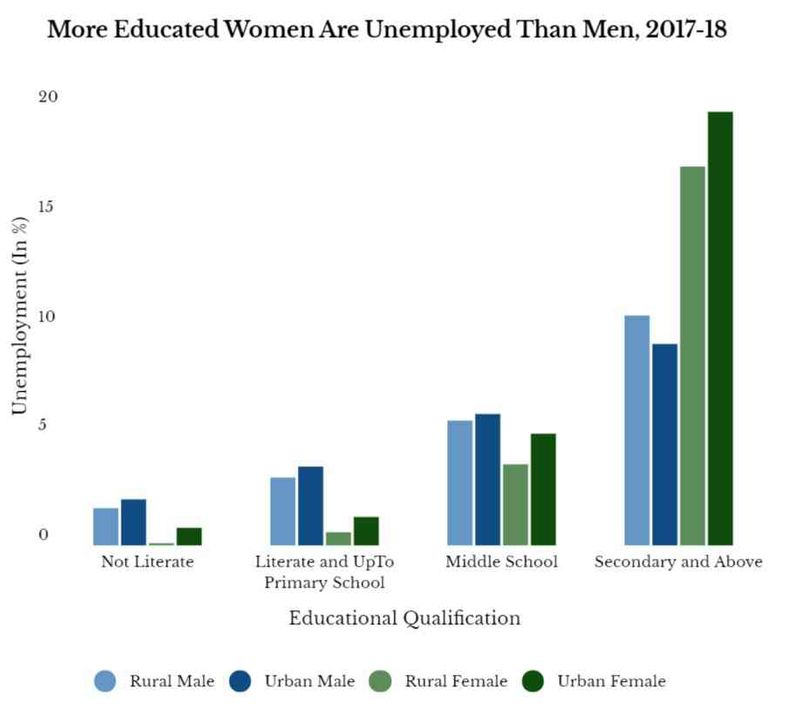 2017-18 കാലങ്ങളില് വിദ്യാഭ്യാസം നേടിയിട്ടും പല സ്ത്രീകളും വീട്ടിലിരുന്നു. അത് തൊഴില്രഹിതരായ പുരുഷന്മാരുടെ എണ്ണത്തേക്കാള് കൂടുതലായിരുന്നുവെന്ന് പീരിയോഡിക് ലേബര് ഫോഴ്സ് സര്വേയുടെ വിവരങ്ങള് പറയുന്നു. ഇന്ത്യയിലെ അവസ്ഥ അനുസരിച്ച് വിദ്യാഭ്യാസം എന്നത് പലപ്പോഴും ജോലിക്കുള്ള കാരണം പോലുമാകുന്നില്ല. പല സ്ഥാപനങ്ങളും നല്കുന്ന നിലവാരമില്ലാത്ത വിദ്യാഭ്യാസം, കുഞ്ഞുങ്ങളെ പരിചരിക്കാനുള്ള സഹായക്കുറവ് എന്നിവയെല്ലാം സ്ത്രീകള് ജോലിക്ക് പോകുന്നതില്നിന്നും തടയുന്നു. പല സ്ത്രീകളും വിവാഹം കഴിയുന്നതോടെയോ കുഞ്ഞുങ്ങളായിക്കഴിയുന്നതോടെയോ ആണ് ജോലി നിര്ത്തി വീട്ടിലിരിക്കുന്നത്. കുഞ്ഞുങ്ങള് വളര്ന്നുകഴിയുമ്പോഴേക്കും പഠിച്ചതെല്ലാം മറക്കുകയും പ്രായം കൂടുകയും ജോലിസാധ്യത കുറയുകയും ചെയ്യുന്നു.