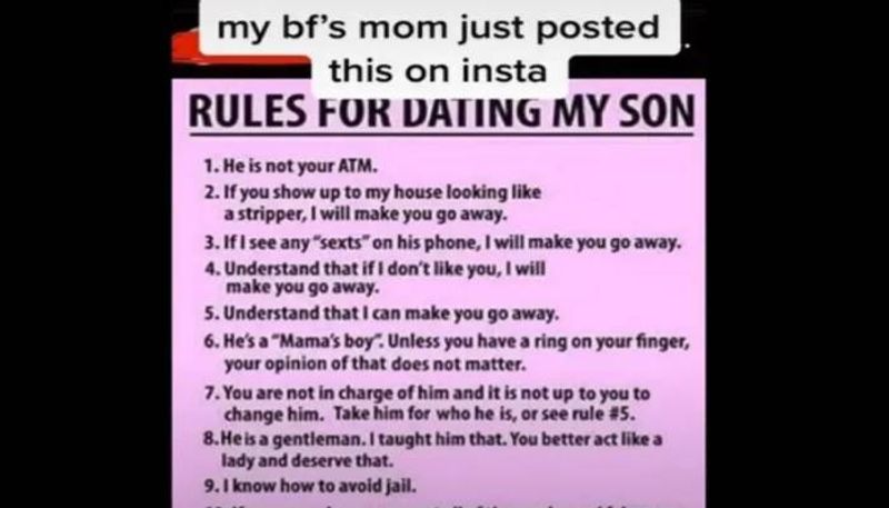 വളരെ വിചിത്രമായ പല പോസ്റ്റുകളും നമ്മൾ സോഷ്യൽ മീഡിയയിൽ കാണാറുണ്ട്. അതുപോലെ അങ്ങേയറ്റം വിചിത്രം എന്ന് തോന്നുന്ന ഒരു പോസ്റ്റാണ് ഇതും. തന്റെ മകനെ പ്രണയിക്കുന്ന പെൺകുട്ടിക്ക് വേണ്ടി അമ്മ തയ്യാറാക്കിയ '10 നിയമ'ങ്ങളാണ് ഈ പോസ്റ്റിൽ ഉള്ളത്.
