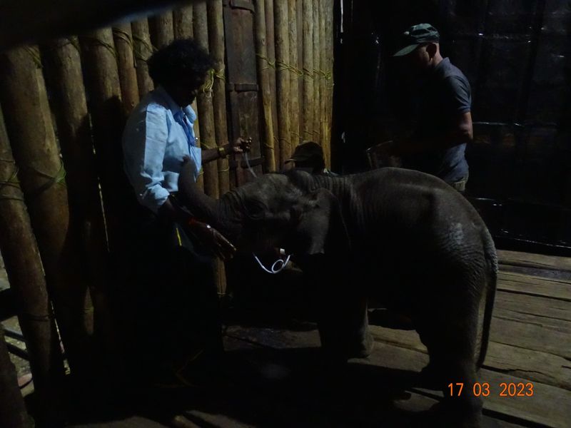 ആനപ്പന്തിയിലെത്തിയ ഈ കുട്ടിക്കുറുമ്പന് പുതിയ കൂടിന് വെളിയില് വെളിച്ചവും ആള്ക്കൂട്ടവും കണ്ടതോടെ കൂട്ടില് കയറാതെ അല്പ്പ സമയം വാശി കാണിച്ച് നിന്നു. ബൊമ്മന് സ്നേഹത്തോടെ വിളിച്ചു നോക്കിയിട്ടും അത് കൂട്ടാക്കിയില്ല. അവസാനമാണ് അത് ചണചാക്കുകള് വിരിച്ച കൂട്ടില് കയറിയത്. അവിടെയും ഈ കുട്ടിയാന കുസൃതി തുടര്ന്നു. പ്രത്യേക പൂജകള്ക്ക് ശേഷമായിരുന്നു ആനക്കുട്ടിയെ കൂട്ടില് കയറ്റിയത്.