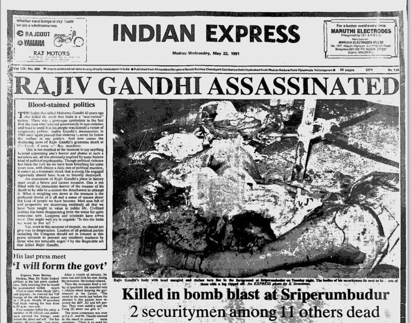 വിശാഖപട്ടണത്തിലെ തിരഞ്ഞെടുപ്പ് പ്രചാരണത്തിനുശേഷം 1991 മേയ് 21-ന് ശ്രീപെരുംപുത്തൂരിലായിരുന്നു അടുത്ത ജാഥ. മദ്രാസിൽ എത്തിയ രാജീവ് ശ്രീപെരുംപുത്തൂരിലേക്ക് വാഹനമാർഗം പുറപ്പെട്ടു. പോകുന്നിടത് പലയിടത്തും വാഹനം നിർത്തി പ്രസംഗിക്കുകയും, ജനങ്ങളെ അഭിസംബോധന ചെയ്യുകയും ചെയ്ത ശേഷമാണ് അദ്ദേഹം ശ്രീപെരുംപുത്തൂരിലെ വേദിയിൽ എത്തുന്നത്. അവിടെ അദ്ദേഹം കാറിൽ നിന്നിറങ്ങുകയും, വേദിക്കരികിലേക്കു നടന്നു പോവുകയും ചെയ്തു. അവിടെ തടിച്ചുകൂടിയ ജനങ്ങൾ നൽകിയ പൂച്ചെണ്ടുകളും, പൂമാലകളും സ്വീകരിച്ച് അദ്ദേഹം അദ്ദേഹം വേദിക്കരികിലേക്കു നടന്നു. രാത്രി പത്തരയോടടുപ്പിച്ച് തനു എന്ന എൽടിടിഇ ചാവേർ രാജീവ് ഗാന്ധിയെ സമീപിച്ച് അനുഗ്രഹം തേടാനെന്ന വ്യാജേന കാലിൽ തൊടാൻ വേണ്ടി കുനിയുകയും, അതിനിടെ തന്റെ അരയിൽ സ്ഥാപിച്ചിരുന്ന ബെൽറ്റ് ബോംബ് പൊട്ടിക്കുകയും ചേയ്തു. അന്നവിടെ നടന്ന സ്ഫോടനത്തിൽ രാജീവ് ഗാന്ധിയെക്കൂടാതെ പതിനാലു പേർ കൂടി കൊല്ലപ്പെട്ടു.