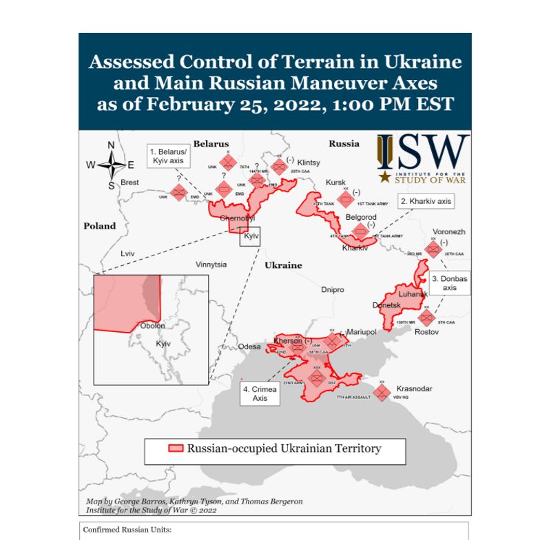 ബെലാറുസ്/കീവ്, ഖാര്ഖിവ്, ഡോണ്ബാസ്, ക്രിമിയ-ഖെര്സണ് എന്നിങ്ങനെ നാല് അച്ചുതണ്ടുകളിലൂടെയാണ് റഷ്യന് സൈന്യത്തിന്റെ മര്മ്മപ്രധാനമായ ആക്രമണങ്ങള് നടന്നത്. അവ ഏതെന്ന് നോക്കാം: