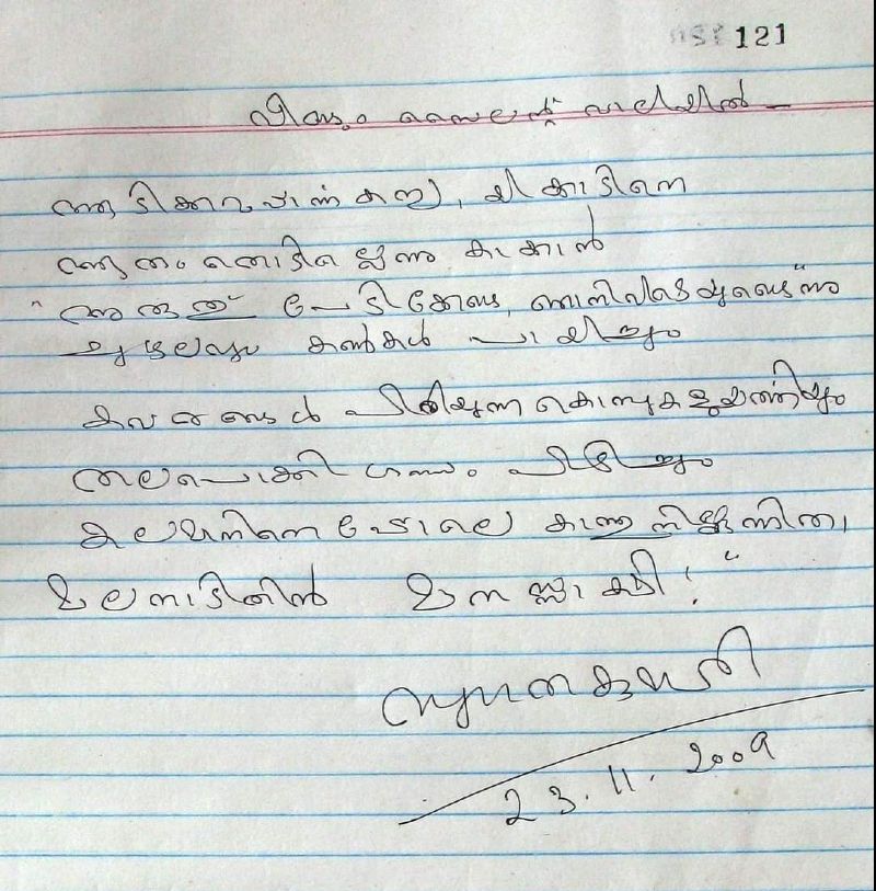 സൈലന്റ് വാലി നാഷനല് പാര്ക്ക് ഓഫീസിലെ സന്ദര്ശക പുസ്തകത്തില് 2009 നംബര് 23-ന് സുഗതകുമാരി എഴുതിയ വരികള്