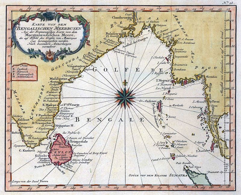('ഗോൾഫ് ഡി ബംഗാൾ', കോറമാണ്ടൽ തീരം ഉൾപ്പെടെയുള്ള തുറമുഖങ്ങളുടെ ബെല്ലിന്റെ ഭൂപടം. (യൂണിവേഴ്സൽ ഇമേജസ് ഗ്രൂപ്പ് / ഗെറ്റി))