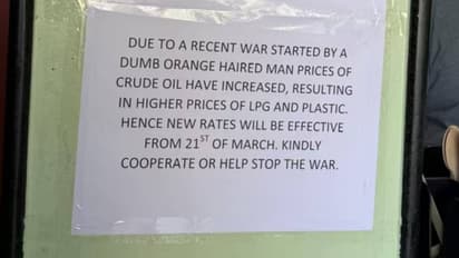 നോട്ടീസിൽ എഴുതിയിരിക്കുന്നത് ഇങ്ങനെയാണ്; 'ഓറഞ്ച് നിറത്തിലുള്ള മുടിയുള്ള ഒരു മണ്ടൻ തുടങ്ങിയ യുദ്ധം കാരണം ക്രൂഡ് ഓയിൽ വില വർദ്ധിച്ചിരിക്കുന്നു. ഇതിന്റെ ഫലമായി എൽപിജി, പ്ലാസ്റ്റിക് എന്നിവയ്ക്കും വില കൂടി. അതിനാൽ മാർച്ച് 21 മുതൽ പുതിയ നിരക്കുകൾ നിലവിൽ വരും. ദയവായി സഹകരിക്കുക, അല്ലെങ്കിൽ ആ യുദ്ധം നിർത്താൻ സഹായിക്കുക'.