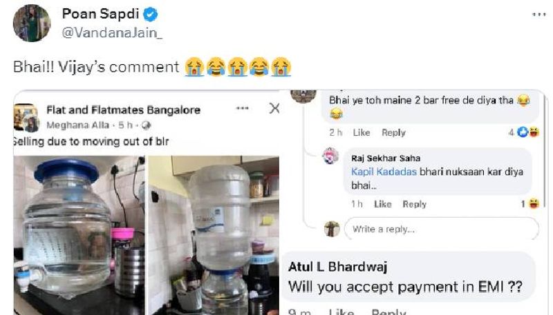 ഇപ്പോൾ യുവതിയുടെ പോസ്റ്റ് കണ്ട് സോഷ്യൽ മീഡിയ അവളെ ട്രോളി കൊല്ലുകയാണ്. ഒരു വാട്ടർ ഡിസ്പൻസറും അതിന്റെ രണ്ട് കാനുകളുമാണ് യുവതി വിൽക്കാൻ വച്ചിരിക്കുന്നത്. ബംഗളൂരുവിൽ നിന്നുള്ള യുവതി താൻ താമസം മാറിപ്പോവുകയാണ് എന്നും അതുകൊണ്ടാണ് ഇവ വിൽക്കാൻ വച്ചിരിക്കുന്നത് എന്നും വ്യക്തമാക്കിയിട്ടുണ്ട്. ഫേസ്ബുക്കിലെ ഫ്ലാറ്റ്സ് ആൻഡ് ഫ്ലാറ്റ്മേറ്റ്സ് (Flat and Flatmates Bangalore) എന്ന ഗ്രൂപ്പിലാണ് വാട്ടർ ഡിസ്പെൻസറും കാനുകളും വിൽക്കുന്നതായി യുവതി പറഞ്ഞിരിക്കുന്നത്.