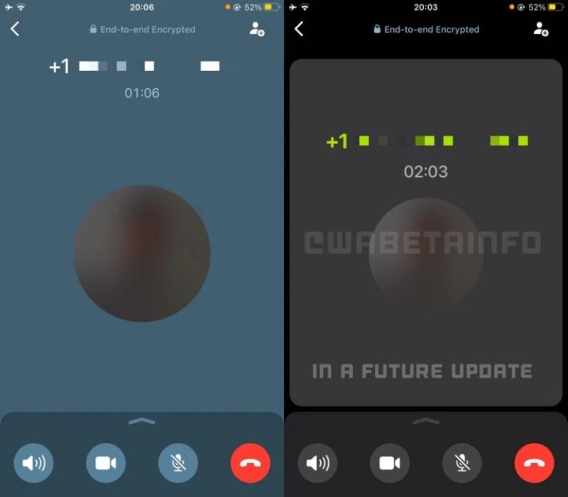 എല്ലാ ബട്ടണുകളും ഇന്റര്ഫേസ് ഘടകങ്ങളും ദൃഢമായി നിലനില്ക്കുന്നതിനാല്, കോള് സ്ക്രീന് മാറുന്നില്ല. ആന്ഡ്രോയിഡിനായുള്ള വാട്ട്സ്ആപ്പ് ബീറ്റയുടെ ഭാവി അപ്ഡേറ്റിനായി വാട്ട്സ്ആപ്പ് അതേ പുനര്രൂപകല്പ്പന ആസൂത്രണം ചെയ്യുന്നു. സംഗതി കുറച്ചുകൂടി ആധുനികവും അല്പ്പം കൂടി വൃത്തിയാക്കുന്നതുമാണെന്ന് തോന്നുന്നു. മധ്യഭാഗത്ത് വൃത്താകൃതിയിലുള്ള ചാരനിറത്തിലുള്ള ചതുരം, അതില് നിങ്ങളുടെ കോണ്ടാക്റ്റിന്റെ പേര്/നമ്പര്, പ്രൊഫൈല് ചിത്രം എന്നിവ കാണാം. പുറമേ, എല്ലാ കോളുകളും എന്ഡ്-ടു-എന്ഡ് എന്ക്രിപ്റ്റ് ചെയ്തതാണെന്ന് ഉപയോക്താക്കളെ ഓര്മ്മിപ്പിക്കുന്ന സൂചകങ്ങള് ചേര്ക്കാന് പദ്ധതിയിടുന്നു. വോയ്സ്, വീഡിയോ കോളുകള്ക്കായി, ഈ സന്ദേശം ആപ്പിന്റെ കോളുകള് ടാബില് വിളിക്കുകയോ സ്വീകരിക്കുകയോ ചെയ്യുന്ന എല്ലാ കോളുകള്ക്ക് കീഴിലും ദൃശ്യമാകും.