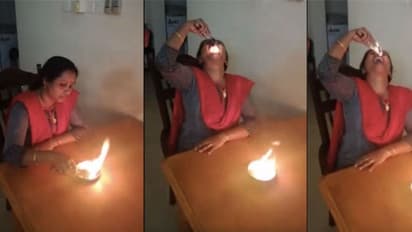 പാത്രത്തിലുളള തീയുരുളകള് വിഴുങ്ങുന്ന വീട്ടിമ്മ അക്ഷരാര്ത്ഥത്തില് സോഷ്യല് മീഡിയയെ ഞെട്ടിക്കുകയായിരുന്നു. നേരമേറെ വൈകിയും ഭർത്താവിനെ കാണാതെ കുടുംബത്തു "തീ" തിന്നുകഴിയുന്ന ഒരു പാവം വീട്ടമ്മ എന്ന തലക്കെട്ടോടെയാണ് വീഡിയോ പ്രചരിക്കുന്നത്.