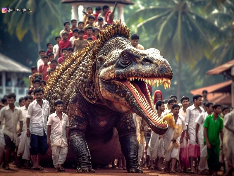 ആറ് കോടി വര്ഷം മുമ്പ് ഭൂമുഖത്ത് ജീവിച്ചിരുന്ന ടൈറനോസോറസുകള് തൃശ്സൂര് പൂരത്തിന് തിടമ്പേറ്റിയാല് ഏങ്ങനെയിരിക്കും. പ്രത്യേകിച്ചും കേരളത്തില് അരിക്കൊമ്പനും ചക്കക്കൊമ്പനും ആഴ്ചകളായി വാര്ത്താ പ്രാധാന്യം നേടുന്ന കാലത്ത്?