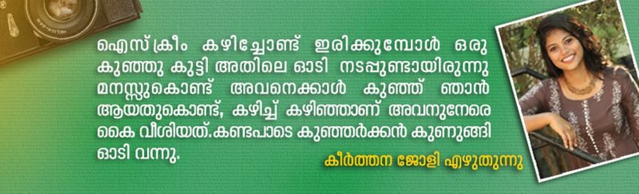 ഐസ്ക്രീം കഴിച്ചോണ്ട് ഇരിക്കുമ്പോള് ഒരു കുഞ്ഞു കുട്ടി അതിലെ ഓടി നടപ്പുണ്ടായിരുന്നു മനസ്സുകൊണ്ട് അവനെക്കാള് കുഞ്ഞ് ഞാന് ആയതുകൊണ്ട്, കഴിച്ച് കഴിഞ്ഞാണ് അവനുനേരെ കൈ വീശിയത്. കണ്ടപാടെ കുഞ്ഞര്ക്കന് കുണുങ്ങി ഓടി വന്നു.