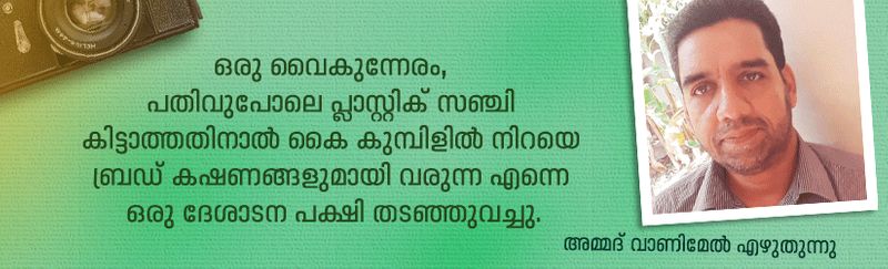 ഒരു വൈകുന്നേരം, പതിവുപോലെ പ്ലാസ്റ്റിക് സഞ്ചി കിട്ടാത്തതിനാല് കൈ കുമ്പിളില് നിറയെ ബ്രഡ് കഷണങ്ങളുമായി വരുന്ന എന്നെ ഒരു ദേശാടന പക്ഷി തടഞ്ഞുവച്ചു.