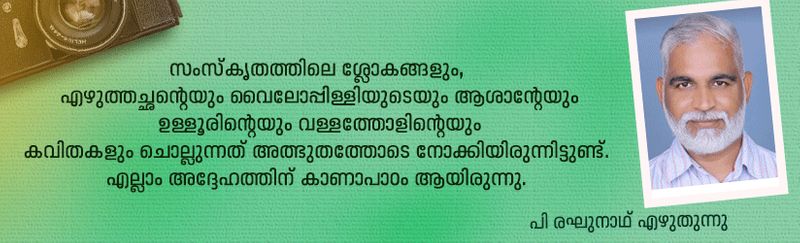 സംസ്കൃതത്തിലെ ശ്ലോകങ്ങളും, എഴുത്തച്ഛന്റെയും വൈലോപ്പിള്ളിയുടെയും ആശാന്റേയും ഉള്ളൂരിന്റെയും വള്ളത്തോളിന്റെയും കവിതകളും ചൊല്ലുന്നത് അത്ഭുതത്തോടെ നോക്കിയിരുന്നിട്ടുണ്ട്. എല്ലാം അദ്ദേഹത്തിന് കാണാപാഠം ആയിരുന്നു. കവിത ചൊല്ലി തീരുമ്പോള് ചില ചോദ്യങ്ങളും സംശയങ്ങളും ഉന്നയിക്കും.