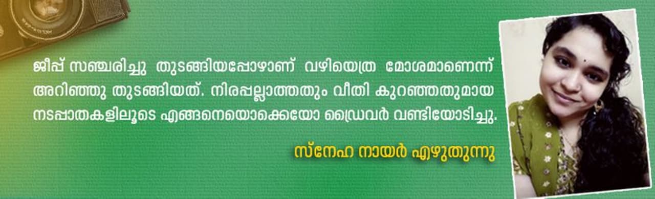 ജീപ്പ് സഞ്ചരിച്ചു തുടങ്ങിയപ്പോഴാണ് വഴിയെത്ര മോശമാണെന്ന് അറിഞ്ഞു തുടങ്ങിയത്. നിരപ്പല്ലാത്തതും വീതി കുറഞ്ഞതുമായ നടപ്പാതകളിലൂടെ എങ്ങനെയൊക്കെയോ ഡ്രൈവര് വണ്ടിയോടിച്ചു. ബിനു മുന്സീറ്റിലിരുന്ന് അയാളെ കളിയാക്കുകയായിരുന്നു. അയാള്ക്ക് മലയാളം അറിയില്ലല്ലോയെന്ന ധാര്ഷ്ട്യത്തില് ഞാനും വിസ്മയയും അയാളെ കളിയാക്കിക്കൊന്നു. 'നിമ്മ ഹെസരെനൂ...?' ആകെ അറിയാവുന്ന കന്നടയെടുത്ത് കാച്ചി ഞാനവിടെ ആളു കളിച്ചു.