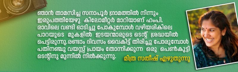 ഞാന് താമസിച്ച സനാപൂര് ഗ്രാമത്തില് നിന്നും ഇരുപത്തിയേഴു കിലോമീറ്റര് മാറിയാണ് ഹംപി. രാവിലെ വണ്ടി ഓടിച്ചു പോകുമ്പോള് വഴിയരികിലെ പാറയുടെ മുകളില് ഇടയന്മാരുടെ ടെന്റ് ശ്രദ്ധയില് പെട്ടിരുന്നു. രണ്ടാം ദിവസം വൈകിട്ട് തിരിച്ചു പോരുമ്പോള് പതിനഞ്ചു വയസ്സ് പ്രായം തോന്നിക്കുന്ന ഒരു പെണ്കുട്ടി ടെന്റിനു മുന്നില് നില്ക്കുന്നു.