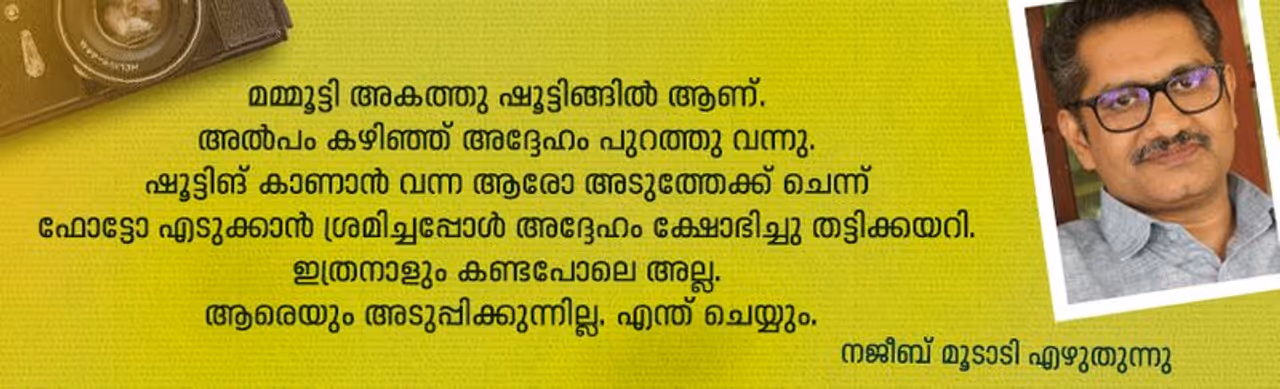 മമ്മൂട്ടി അകത്തു ഷൂട്ടിങ്ങില് ആണ്. അല്പം കഴിഞ്ഞ് അദ്ദേഹം പുറത്തു വന്നു. ഷൂട്ടിങ് കാണാന് വന്ന ആരോ അടുത്തേക്ക് ചെന്ന് ഫോട്ടോ എടുക്കാന് ശ്രമിച്ചപ്പോള് അദ്ദേഹം ക്ഷോഭിച്ചു തട്ടിക്കയറി. ഇത്രനാളും കണ്ടപോലെ അല്ല. ആരെയും അടുപ്പിക്കുന്നില്ല. എന്ത് ചെയ്യും.