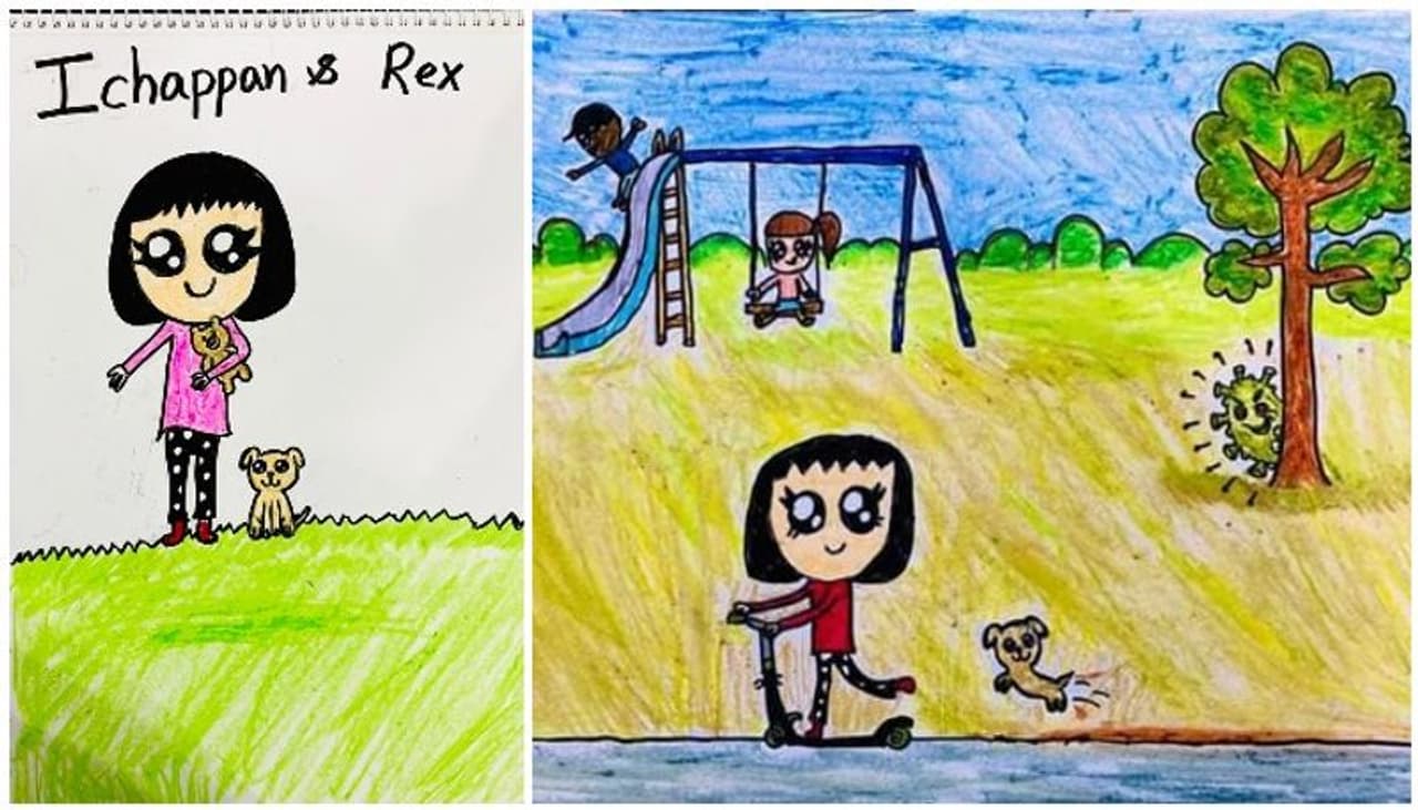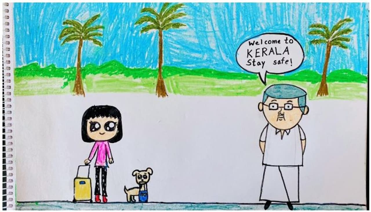 പുറകിൽ കൈ കെട്ടി നിൽക്കുകയാണ് മുഖ്യമന്ത്രി. വിദേശത്ത് നിന്ന് വലിയ പെട്ടിയുമായി വരുകയാണ് പെൺകുട്ടി. ഒപ്പം അവളുടെ ഓമന നായയുമുണ്ട്. നായയുടെ വായിൽ ഒരു കുഞ്ഞു ബാഗമുണ്ട്. അവന് അത്രയല്ലേ എടുക്കാൻ പറ്റൂ. ഇവരോട് മുഖ്യമന്ത്രി പറയുകയാണ്. 'കേരളത്തിലേക്ക് സ്വാഗതം. സുരക്ഷിതരായിരിക്കൂ' എന്ന്. ഇച്ചപ്പൻ എന്ന നിയമോളുടെ ഒരുപാട് വരകളിൽ ഒന്നാണിത്. ചുറ്റുമുള്ള ലോകത്തെ അവിടത്തെ കാഴ്ചകളെ എങ്ങനെയാണ് ഒരു ഏഴുവയസ്സുകാരി വരയാക്കുന്നതെന്ന് അറിയാൻ ഈ ഒരൊറ്റ ചിത്രം മതി.