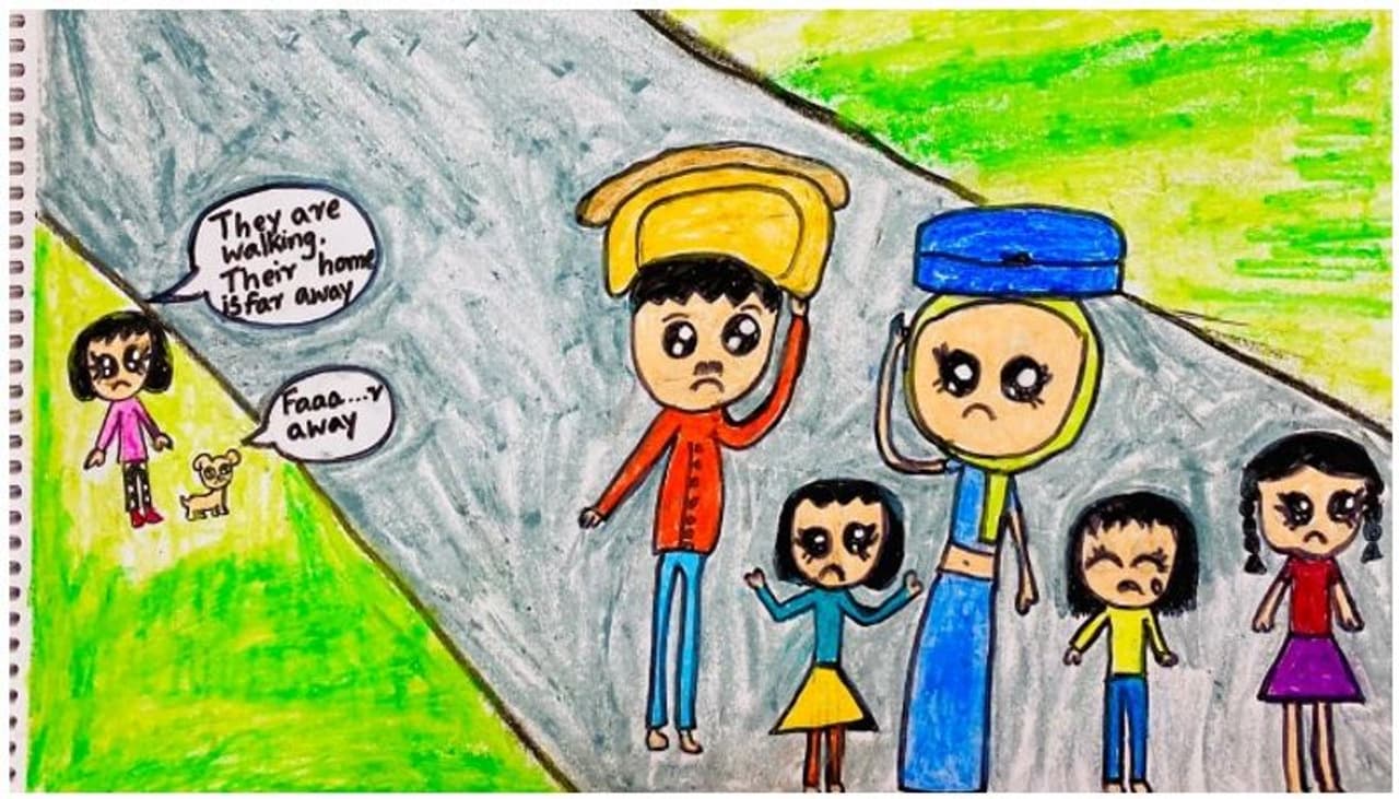 ലോക്ക് ഡൗൺ കാലത്തെ സങ്കടക്കാഴ്ചകളിലൊന്നായിരുന്നു കയ്യിൽ കിട്ടിയതെടുത്ത് നടന്നു നാടുപിടിക്കുന്ന അതിഥി തൊഴിലാളികൾ. വാർത്ത കാണുന്ന പതിവുള്ളത് കൊണ്ട് ആ കാഴ്ചകളെയും നിയ വരയാക്കി. അച്ഛനും അമ്മയും മൂന്നു കുട്ടികളുമടങ്ങുന്ന ഒരു കുടുംബമാണ് ചിത്രത്തിലുള്ളത്. നിയ റെക്സിനോട് പറയുന്നുണ്ട്, 'അവർ നടക്കുകയാണ്. ഒരുപാട് ദൂരത്താണ് അവരുടെ വീട്,' എപ്പഴത്തെയും പോലെ കൂടെയുള്ള റെക്സ് ചോദിക്കുന്നുണ്ട്, 'ഒരുപാട് ദൂരെയാണോ?' എല്ലാ ചിത്രങ്ങളലും കൊറോണയുണ്ട് എന്നതാണ് മറ്റൊരു വ്യത്യസ്തത.
