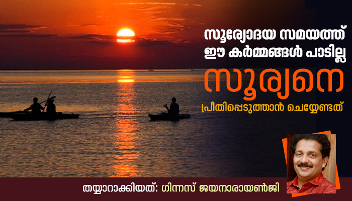 പണ്ടുകാലത്ത് തന്നെ സൂര്യോദയസമയത്ത് പാടില്ലാത്ത കര്മ്മങ്ങള് എന്ന പറയപ്പെടുന്നവ കുഞ്ഞിന് പേരിടുന്നത്,അന്നപ്രവേശം,കുഞ്ഞിനെ ആദ്യമായി പുറത്തേക്ക് കൊണ്ടു പോകുന്നത്, വിവാഹം, ഗൃഹാരംഭം,ഗൃഹപ്രവേശം എന്നീകര്മ്മങ്ങള് ആണ്.ഒരു വ്യക്തിയുടെ ജന്മനാള് ഞായറാഴ്ച്ചയാണ് വരുന്നതെങ്കില് ആ വര്ഷം ദൂരദേശയാത്രയാണ് ഫലം.ഞായറാഴ്ച്ച പിറന്നാള് വന്നാള് ദോഷപരിഹാരാര്ത്ഥം സൂര്യന്,ശിവന് എന്നിവരെ വിശേഷാല് ആരാധിക്കണം.ഞായറാഴ്ച്ചവ്രതം എടുക്കണം, പൊങ്കാല ഇടുക എന്നീ സൂര്യപ്രീതികരങ്ങളായ കര്മ്മങ്ങള് ചെയ്യണം.