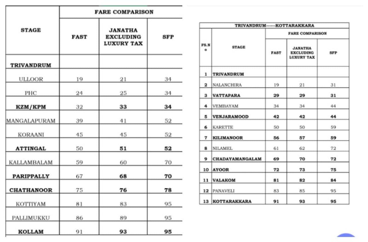 കൊല്ലം കൊട്ടാരക്കര യൂണിറ്റുകളിൽ നിന്നും എല്ലാ ഫാസ്റ്റ് സ്റ്റോപ്പിലും നിർത്തുന്ന ജനത സർവ്വീസ് രാവിലെ 7.15 ന് ആരംഭിച്ച് 9.30 ന് തിരുവന്തപുരത്ത് എത്തിച്ചേരും തുടർന്ന് 10 മണിക്ക് തിരികെ പോകുന്ന ബസുകൾ 12 മണിക്ക് തിരികെ കൊല്ലത്തും, കൊട്ടരക്കരയിലും എത്തിച്ചേരും, തുടർന്ന് വീണ്ടും ഉച്ചക്ക് 2.20 ന് പുറപ്പെട്ട് 4.30 ന് തിരുവനന്തപുരത്ത് എത്തി 5 മണിക്ക് തമ്പാനൂർ വഴുതക്കാട് സ്റ്റാച്ചു , പട്ടം (മെഡിക്കൽ കോളേജ് - കൊല്ലം ബസ്) കേശവദാസപുരം എന്നീ സ്ഥലങ്ങളിലെ ഓഫീസുകളെ ബന്ധിപ്പിച്ച് തിരികെ പോയി രാത്രി 7.15 ന് സർവീസ് അവസാനിപ്പിക്കും.