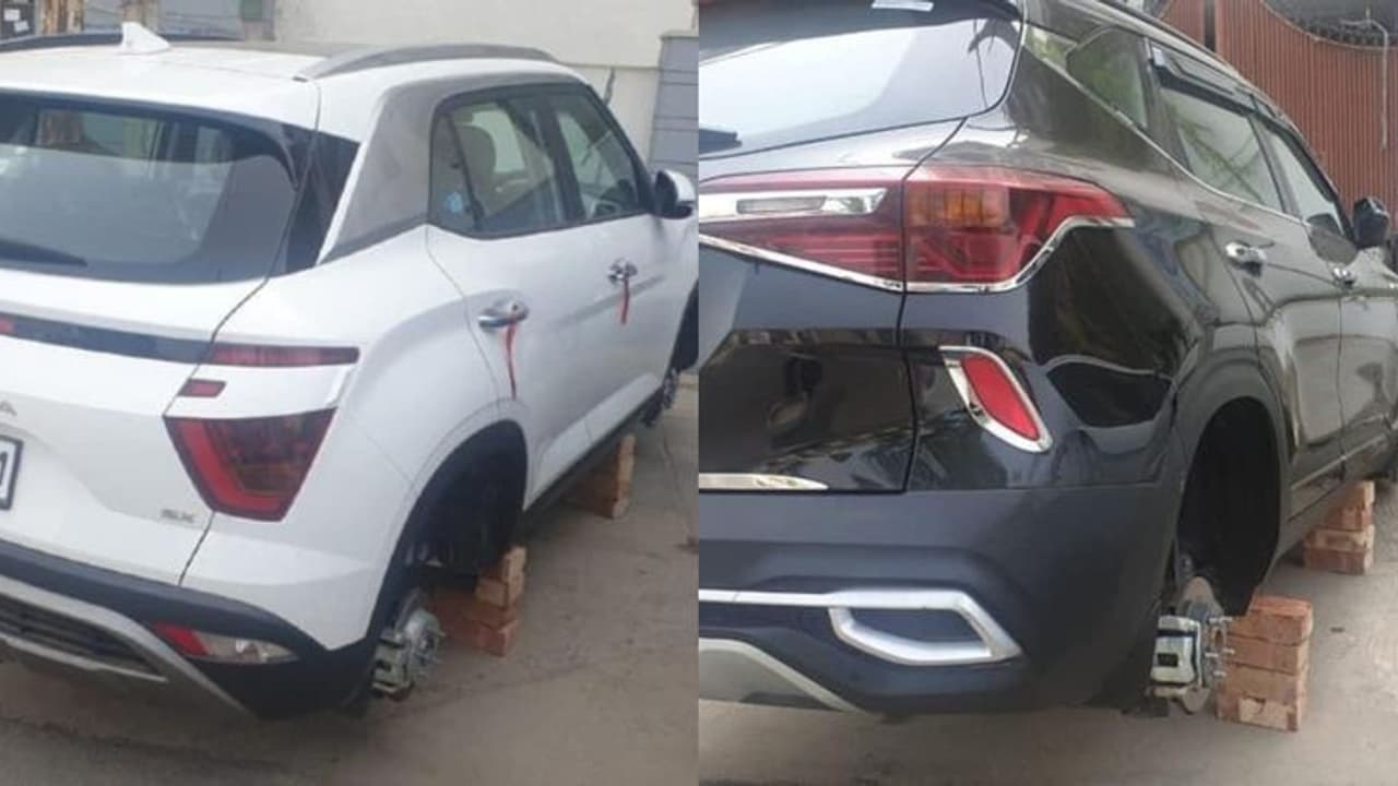 രാത്രി ഒരുമിച്ച് പാർക്ക് ചെയ്തിരുന്ന കിയ സെല്റ്റോസിനും ഹ്യുണ്ടായി ക്രെറ്റയ്ക്കുമാണ് ഈ ദുര്യോഗം. ഉടമകളെ ഞെട്ടിച്ചുകൊണ്ട് ഇരു വാഹനങ്ങളുടെയും നാല് അലോയി വീലുകളും പിറ്റേന്ന് ഉറക്കമുണർന്നപ്പോൾ കാണാതായി. രണ്ട് എസ്യുവികളും വീലുകൾ അഴിച്ചുമാറ്റിയ നിലയിൽ ഇഷ്ടികയ്ക്ക് മേലാണ് കണ്ടെത്തിയത്.