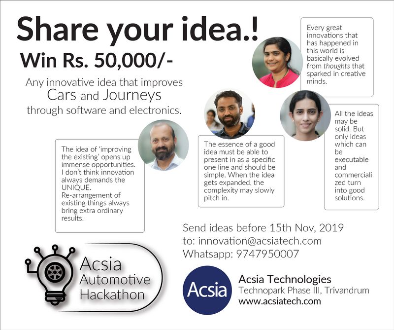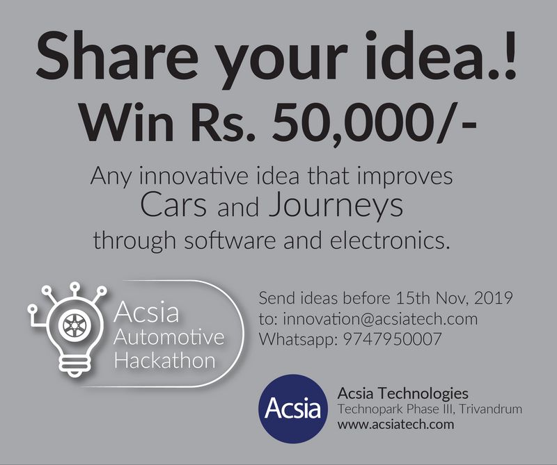ആശയങ്ങൾ നവംബർ 15 നു മുൻപായി innovation@acsiatech.com വിലാസത്തിൽ മെയ്ൽ ചെയ്യുകയോ 9747950007 എന്ന നമ്പറിൽ വാട്സാപ്പ് ചെയ്യുകയോ വേണം. മുതിർന്ന ഓട്ടോമോട്ടീവ് സോഫ്റ്റ്വെയർ എഞ്ചിനീയർമാരുടെ പാനലാണ് വിജയിയെ തിരഞ്ഞെടുക്കുക. വാര്ത്താസമ്മേളനത്തിൽ അക്സിയ ഹാക്കത്തോൺ ഡയറക്ടർ എ സി ജിജിമോൻ കോർഡിനേറ്റർ ആയ ഡി. എ. പ്രവീൺ, ഓട്ടോമോട്ടീവ് സോഫ്റ്റ്വെയർ വിദഗ്ധനായ ജി വസന്ത്രാജ് തുടങ്ങിയവര് പങ്കെടുത്തു.