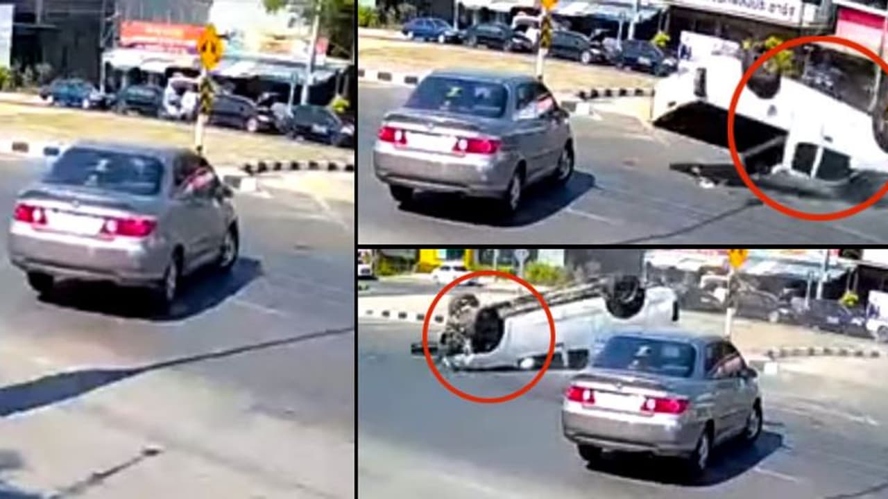 അശ്രദ്ധമായി റോഡിന് കുറുകെ യൂടേൺ എടുക്കാൻ ശ്രമിച്ച കാറിൽ ഇടിക്കാതിരിക്കാൻ വെട്ടിച്ച പിക്കപ്പ് ട്രക്ക് മറിയുന്നതിന്റെ ദൃശ്യങ്ങളാണ് വീഡിയോയില്. തലകീഴായി മറിഞ്ഞ പിക്കപ്പ് ട്രക്ക് നിരങ്ങി നീങ്ങുന്നതും വിഡിയോയിൽ കാണാം. തായ്ലൻഡിൽ നടന്ന അപകടത്തിന്റെ വീഡിയോ ആണിതെന്നാണ് റിപ്പോര്ട്ടുകള്.