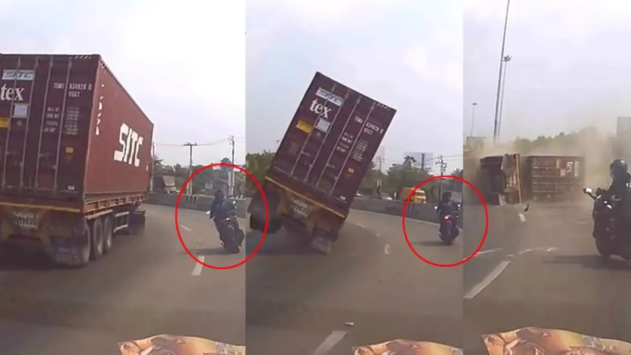 ഓവര്ടേക്ക് ചെയ്യാന് ശ്രമിക്കുന്ന ബൈക്ക് യാത്രികന്റെ സമീപത്തേക്ക് ചെരിഞ്ഞു വീഴുന്ന പടുകൂറ്റന് കണ്ടെയിനര് ലോറി. തലനാരിഴയ്ക്ക് ആ ലോറിയുടെ കീഴില് നിന്നും രക്ഷപ്പെടുകയാണ് ബൈക്കുകാരന്. കഴിഞ്ഞ കുറച്ചുദിവസങ്ങളായി സോഷ്യല് മീഡിയയില് വൈറലായിക്കൊണ്ടിരിക്കുന്ന ഒരു വീഡിയോ ആണിത്.