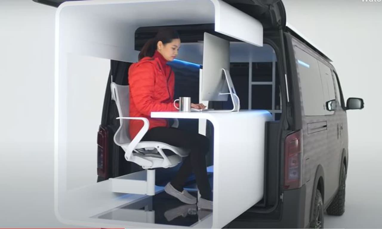 ഒരു വാനിനുള്ളിൽ ഒരു ഓഫീസ് സൂക്ഷിച്ചിരിക്കുന്നു. ഒരു മേശയും കസേരയുമുണ്ട്, ഇവ രണ്ടും കാരവന്റെ പിൻഭാഗത്ത് ഭംഗിയായി യോജിക്കുന്നു. എന്നാൽ അകത്ത് ഇരിക്കുമ്പോൾ ബോറടിക്കുമ്പോൾ, വാനിന്റെ പിൻവാതിലിൽ നിന്ന് ഓഫീസ് സ്ലൈഡ് ചെയ്യാൻ നിങ്ങൾക്ക് തിരഞ്ഞെടുക്കാം. കൂടുതൽ വിശാലവും തുറന്നതുമായ ഇടം സൃഷ്ടിക്കാൻ കസേരയ്ക്കും മേശയ്ക്കും വാഹനത്തിൽ നിന്ന് എളുപ്പത്തിൽ ഇറക്കാനും കഴിയും. അതുകൊണ്ട് ജോലി ചെയ്യുന്ന ഒരാൾക്ക് പുറത്ത് കാഴ്ചകൾ ആസ്വദിക്കാനും സാധിക്കും.