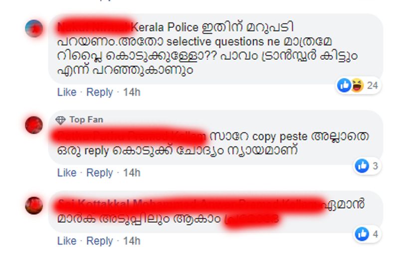 മിക്ക കമന്റുകള്ക്കും മറുപടി പറയുന്ന പൊലീസ് ഈ കമന്റുകള്ക്ക് എന്താണ് ഉത്തരം തരാത്തതെന്നും പലരും ചോദിക്കുന്നുണ്ട്. സെലക്ടീവ് ചോദ്യങ്ങള്ക്ക് മാത്രമേ പൊലീസ് മറുപടി നല്കുകയുള്ളോ എന്നും ട്രാൻസ്ഫർ ഭയന്നിട്ടാണോ എന്നുമൊക്കെയാണ് ചിലരുടെ ചോദ്യം.