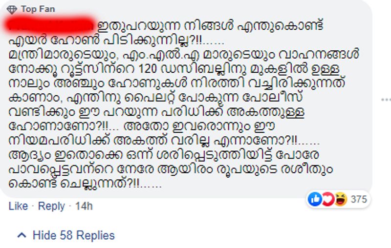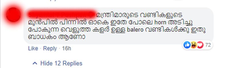 മന്ത്രിമാരുടെ വണ്ടികളുടെ മുമ്പിലും പിന്നിലും ഓകെ ഇതേ പോലെ ഹോണ് അടിച്ചു പോകുന്ന വെളുത്ത നിറത്തിലുള്ള ബൊലേറോകൾക്കും ഇതു ബാധകം ആണോ, ഒരു മന്ത്രിയുടെ വാഹനം കടന്നുപോകുമ്പോൾ മിനിമം മൂന്ന് എസ്കോർട്ട് വണ്ടികളെങ്കിലും കാണാം അവർ എല്ലാവരും ഒരേ പോലെ ഹോണടിച്ചു തന്നെയാണ് പോകാറ് എന്നിങ്ങനെ കമന്റുകള് നീളുന്നു.