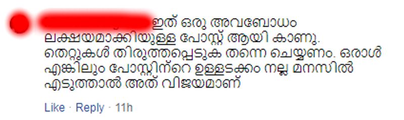 എന്നാല് പോസ്റ്റിനെ അനുകൂലിച്ചും ഇത്തരം കമന്റുകള്ക്ക് മറുപടി പറഞ്ഞും മറ്റും ചിലരും രംഗത്തെത്തിയിട്ടുണ്ട്. അവബോധം ലക്ഷ്യമാക്കിയുള്ള പോസ്റ്റായി ഇതിനെ കാണണമെന്നും ഒരാളെങ്കിലും പോസ്റ്റിന്റെ ഉള്ളടക്കം നല്ല മനസിൽ എടുത്താൽ അത് വിജയമാണെന്നുമാണ് ഒരു കമന്റ്.