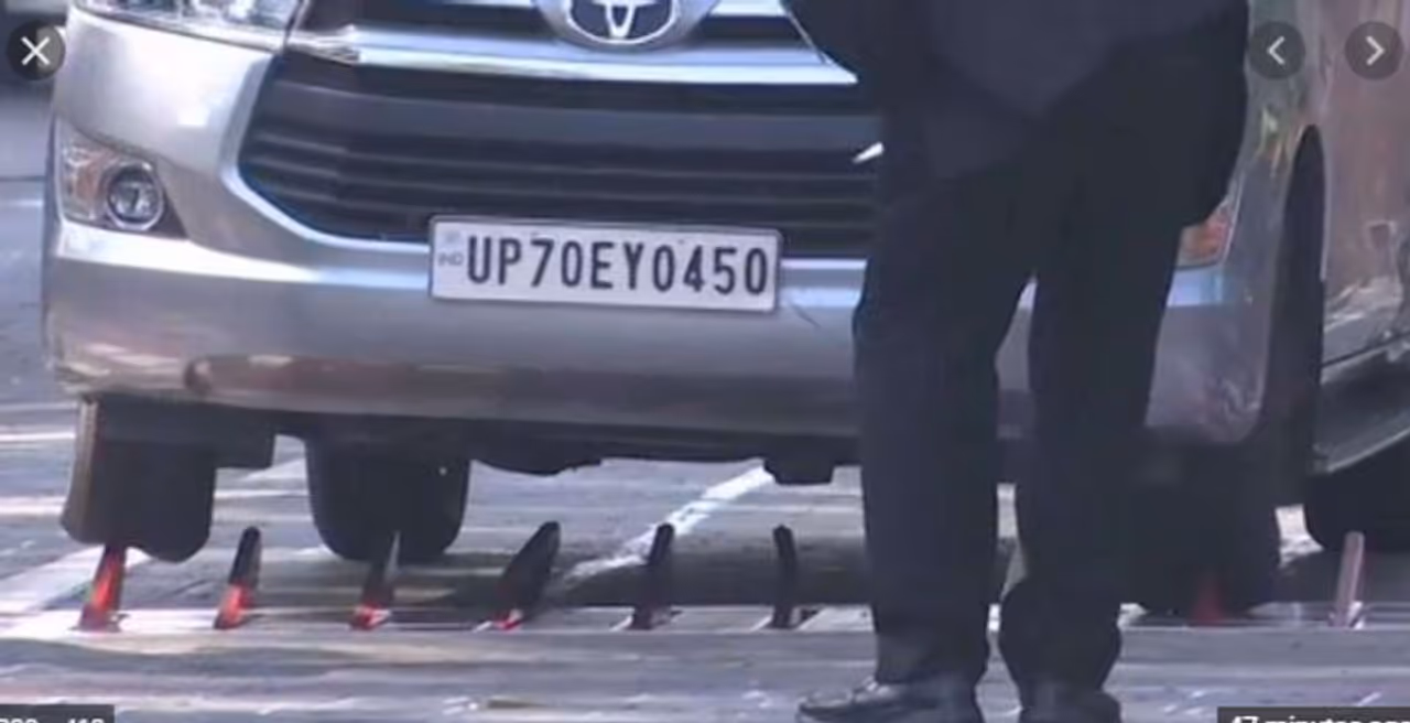 സുരക്ഷാ സ്പൈക്കുകളില് കയറിയിറങ്ങിയ കാറിന്റെ ടയറുകൾ പിളര്ന്നു