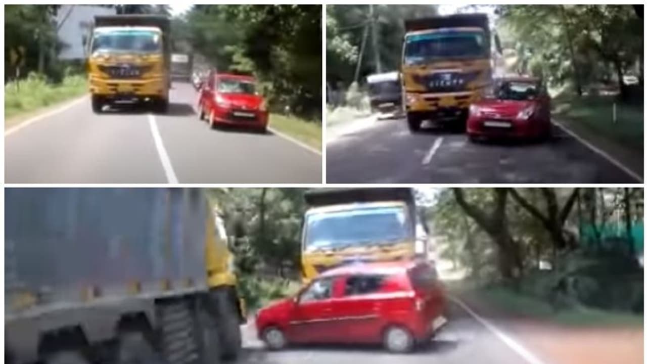 ഒരു കാറിനെ മറികടക്കാൻ ഒരു ടിപ്പര് ലോറി ശ്രമിക്കുന്നതിനിടെയാണ് അപകടം. ഓവർടേക്ക് ചെയ്യാൻ ശ്രമിച്ചപ്പോൾ എതിരെ വാഹനം വന്നതുകൊണ്ട് ഇടതു വശത്തേയ്ക്ക് ഒതുക്കാൻ ടിപ്പര് ഡ്രൈവര് ശ്രമിച്ചു. അപ്പോൾ കാറിന്റെ പിന്നിൽ തട്ടുകയായിരുന്നു. റോഡില് വട്ടംതിരിഞ്ഞ് ടിപ്പറിന്റെ മുന്നിലേയ്ക്ക് എത്തിയ കാറിനെ എതിരെ വന്ന മറ്റൊരു ടിപ്പര് ലോറി ഇടിച്ചുതെറിപ്പിക്കാതിരുന്നത് തലനാരിഴയുടെ വ്യത്യാസത്തിലാണെന്നും വീഡിയോയില് വ്യക്തമായി കാണാം. അപകടം നടന്ന സ്ഥലം ഉള്പ്പെട അപകടത്തിന്റെ കൂടുതൽ വിവരങ്ങൾ ലഭ്യമല്ല.