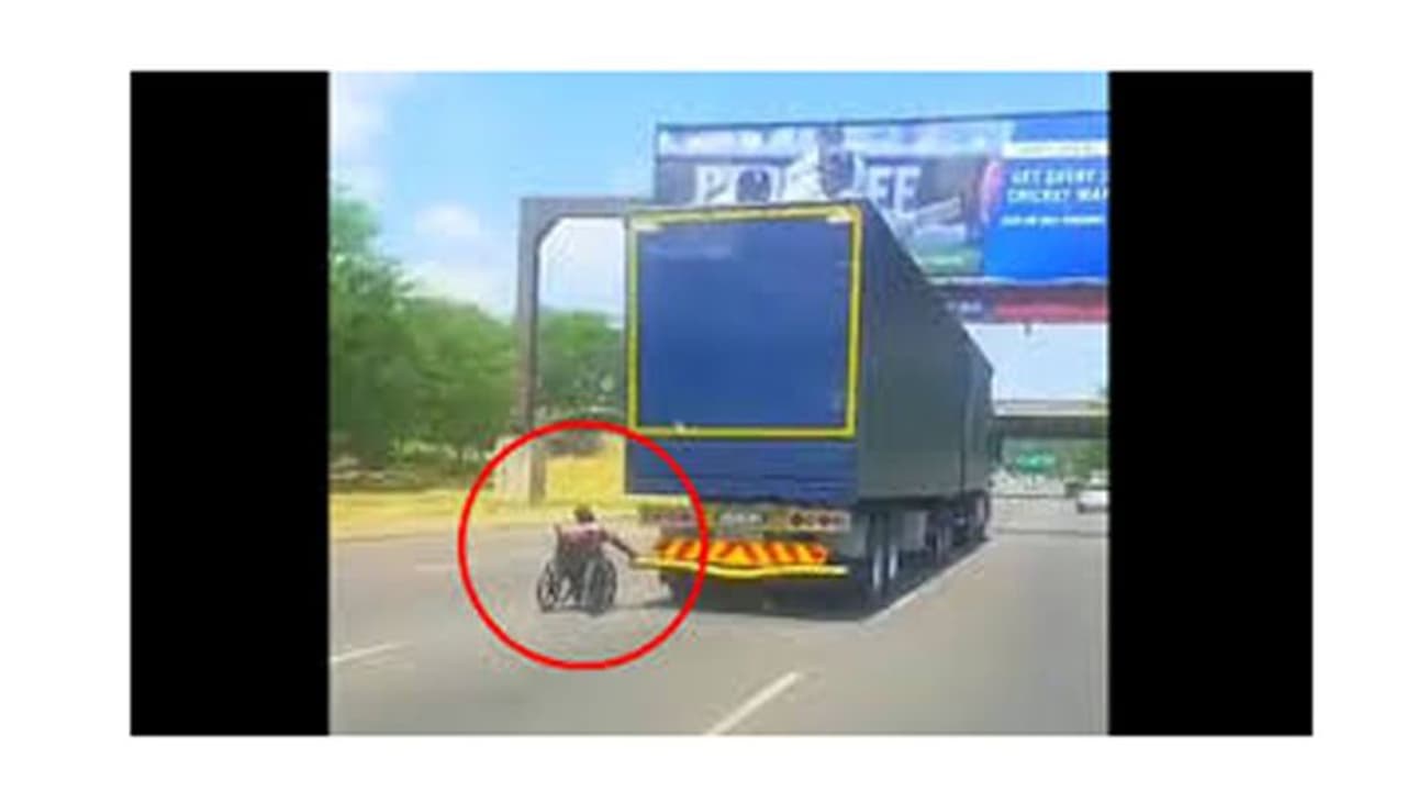 സൗത്ത് ആഫ്രിക്കയിലെ ഒരു ഹൈവേയിലാണ് ഏകദേശം 80 കിലോമീറ്റർ വേഗത്തിലോടുന്ന ട്രക്കിന്റെ പുറകിൽ പിടിച്ച് വീൽചെയറുകാരന് യാത്ര ചെയ്തത്. പുറകെ എത്തിയ കാർ യാത്രികനാണ് സംഭവം ക്യാമറയിൽ പകർത്തിയത്.