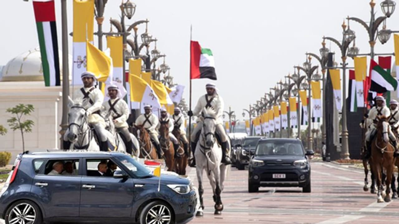 അബുദാബി: ഫ്രാന്സിസ് മാര്പാപ്പയുടെ യുഎഇ സന്ദര്ശനത്തിന്റെ വീഡിയോ ദൃശ്യങ്ങള് ഇപ്പോള് സോഷ്യല് മീഡിയയില് വൈറലാണ്. യുഎഇയിലെ പ്രസിഡൻഷ്യൽ കൊട്ടാരത്തെ ലക്ഷ്യമാക്കി കുതിക്കുന്ന അത്യാഡംബരങ്ങളായ അകമ്പടി വാഹനങ്ങളുടെ നീണ്ട നിര. കുതിച്ചുപായുന്ന അശ്വാരൂഢരായ സൈന്യഗണം. നീലാകാശത്ത് വ്യോമസേനയുടെ വിവിധ തരത്തിലുള്ള അഭ്യാസപ്രകടനങ്ങള്. ഇതിനിടയിലൂടെ പതിയെ നിങ്ങുന്ന ഒരു പാവം കുഞ്ഞന് കാറാണ് ഇപ്പോള് സോഷ്യല് മീഡിയയിലെ താരം.
