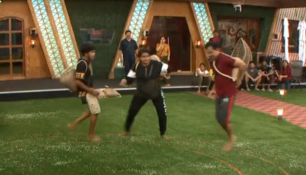 പ്ലേ ഏരിയയില് രണ്ട് വളയങ്ങള് വരച്ചിരുന്നു. ഒരു വലിയ വൃത്തത്തിനുള്ളില് ഒരു ചെറിയ വൃത്തം. ആ വൃത്തങ്ങള്ക്കിടയിലെ പാതയിലൂടെ മൂന്നുപേരും ഓടണമായിരുന്നു. പ്ലാസ്റ്റര് ഓഫ് പാരീസിന്റെ ചെറിയ ബോളുകള് നിറച്ച ബാഗുകളും ഇവര്ക്ക് തോളിലിടാന് കൊടുത്തിരുന്നു. ബാഗില് ഓരോ സുഷിരവും ഉണ്ടായിരുന്നു. സ്വന്തം ബാഗില് നിന്ന് പന്തുകള് നഷ്ടപ്പെടാതെ മറ്റുള്ളവരുടെ പന്തുകള് പരമാവധി പുറത്തെത്തിക്കുക എന്നതായിരുന്നു ടാക്സ്. ആദ്യ റൗണ്ടില് മൂന്നുപേരും മത്സരിച്ച് വിജയിക്കുന്ന രണ്ടുപേര് ചേര്ന്ന് ഫൈനല് കളിക്കണമെന്നും ബിഗ് ബോസ് നിര്ദേശിച്ചു.