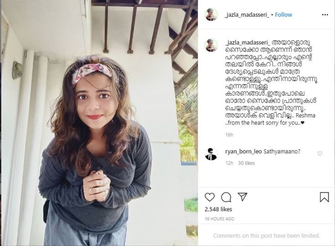 ബിഗ് ബോസില് നിന്ന് പുറത്തുപോയിരിക്കുകയാണ് പുറത്ത് ഏറെ ആരാധകരുള്ള രജിത് കുമാര്. രജിത് കുമാറിനെതിരെ വലിയ കുറ്റമാണ് ബിഗ് ബോസ് ചുമത്തിയിരിക്കുന്നത്. കൂടെയുള്ള ഒരു മത്സരാര്ത്ഥിയെ ആക്രമിക്കുകയാണ് രജിത് കുമാര് ചെയ്തിരിക്കുന്നത്. കണ്ണിന് അസുഖമുള്ള രേഷ്മയുടെ കണ്ണില് മുളക് തേക്കുകയായിരുന്നു രജിത്. തുടര്ന്ന് രേഷ്മയെ ചികിത്സയ്ക്കായി ആശുപത്രിയില് കൊണ്ടുപോവുകയും രജിത്തിനെ താല്ക്കാലികമായി പുറത്താക്കുകയും ചെയ്തു. സംഭവത്തില് വ്യാപകമായ പ്രതികരണങ്ങളാണ് വന്നുകൊണ്ടിരിക്കുന്നത്. ഇപ്പോഴിതാ ബിഗ് ബോസിനകത്ത് ഒപ്പമുണ്ടായിരുന്ന ജസ്ലയുടെ പ്രതികരണവും എത്തിയിരിക്കുകയാണ്. ഇന്സ്റ്റഗ്രാം പോസ്റ്റിലാണ് ജസ്ല ചില കാര്യങ്ങള് പറയുന്നത്.