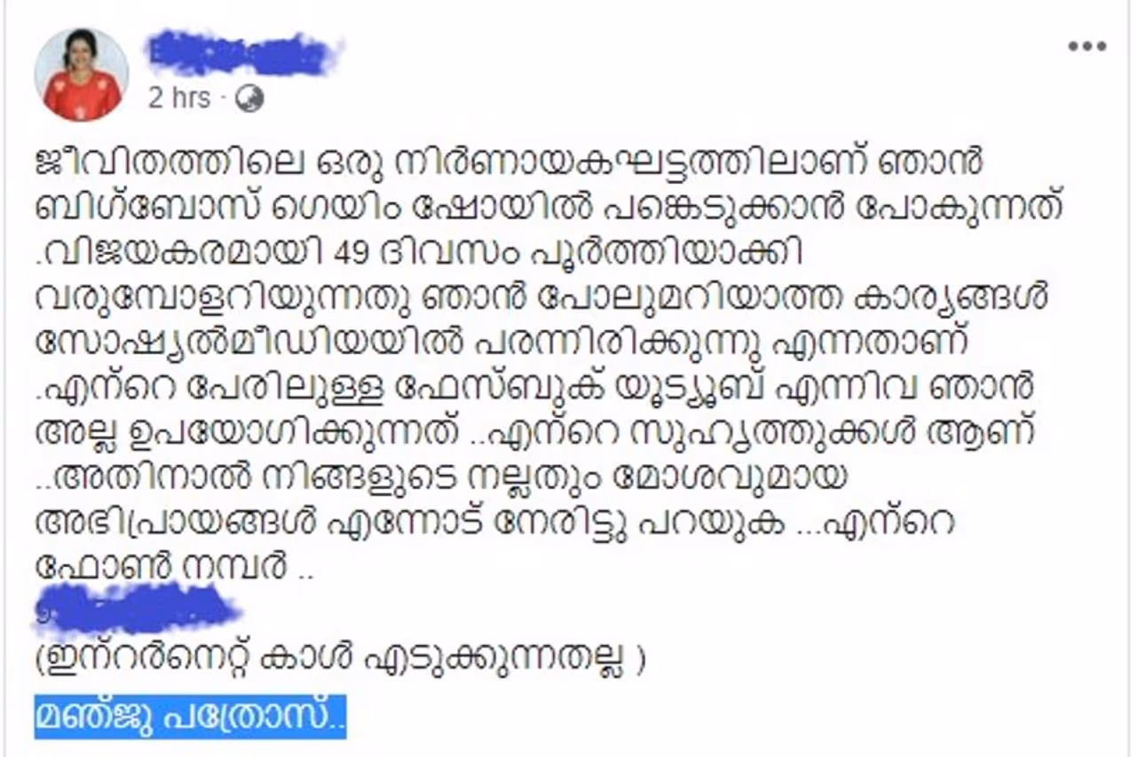 'ജീവിതത്തിലെ ഒരു നിർണായകഘട്ടത്തിലാണ് ഞാൻ ബിഗ്ബോസ് ഗെയിം ഷോയിൽ പങ്കെടുക്കാൻ പോകുന്നത് .വിജയകരമായി 49 ദിവസം പൂർത്തിയാക്കി വരുമ്പോള് അറിയുന്നത് ഞാൻ പോലുമറിയാത്ത കാര്യങ്ങൾ സോഷ്യൽമീഡിയയിൽ പരന്നിരിക്കുന്നു എന്നതാണ്.എന്റെ പേരിലുള്ള ഫേസ്ബുക് യൂട്യൂബ് എന്നിവ ഞാൻ അല്ല ഉപയോഗിക്കുന്നത് .. എന്റെ സുഹൃത്തുക്കൾ ആണ് .. അതിനാൽ നിങ്ങളുടെ നല്ലതും മോശവുമായ അഭിപ്രായങ്ങൾ എന്നോട് നേരിട്ടു പറയുക ...എന്റെ ഫോൺ നമ്പർ ..' ഇതാണ് എന്നായിരുന്നു മഞ്ജു കുറിച്ചത്.