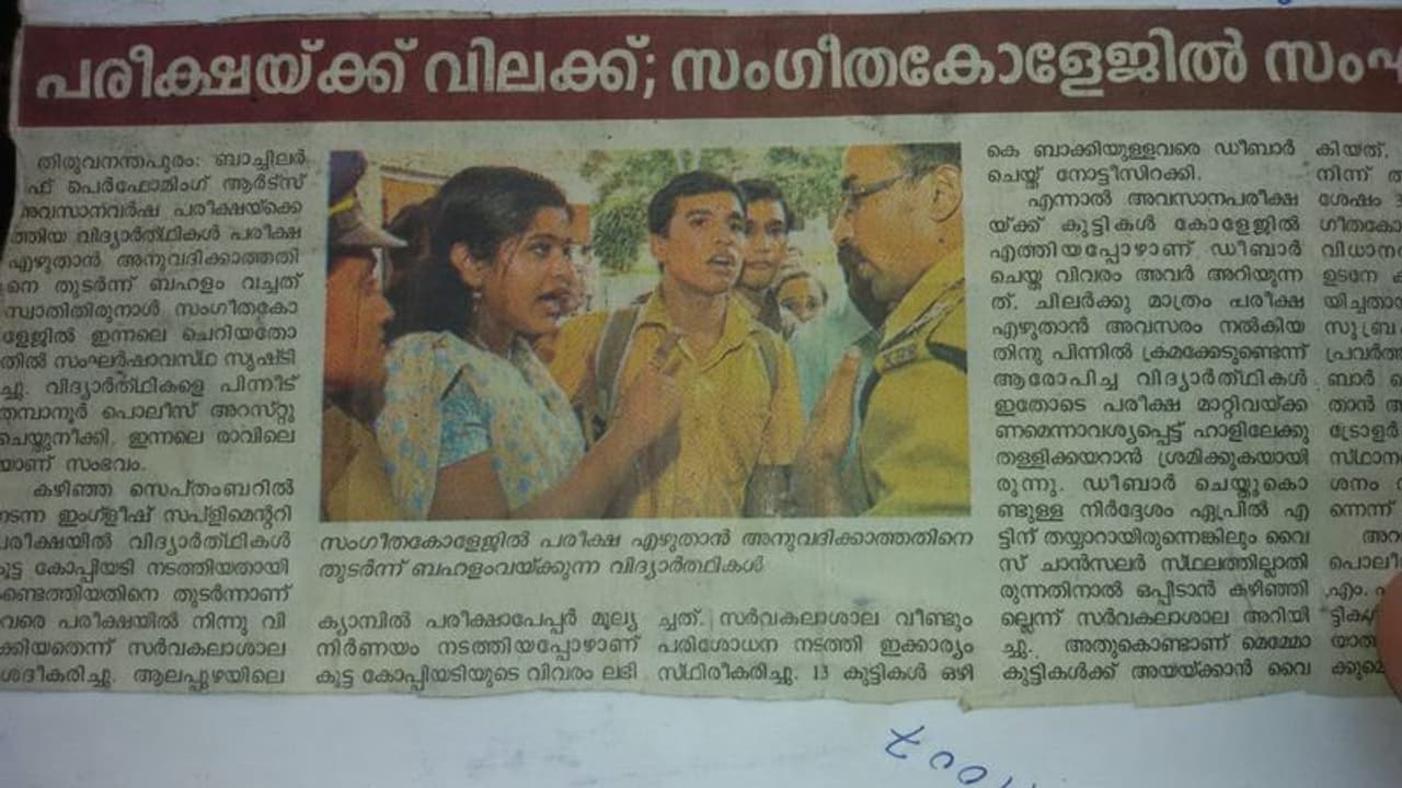 'സംഗീത കോളേജില് ചെയര്പേഴ്സണ് ആയിരുന്ന കാലത്തെ ഒരു പേപ്പര് കട്ടിംഗ്. അന്ന് പ്രതീക്ഷിക്കാതെ എന്റെ കൂട്ടുകാര്ക്ക് വന്ന പരീക്ഷയുടെ വിലക്ക്. അത് ചോദ്യം ചെയുന്ന ഞാന്, അന്നത്തെ തമ്പാനൂര് പോലീസ്സ്റ്റേഷന് എസ് ഐ സര് ആണെന്ന് തോന്നുന്നു. കൂടെ ജസ്റ്റിന്, നീരജ് രഞ്ജിത്ത് (ഇപ്പോള് ഇത് അയച്ചുതന്ന മഹാന്). അന്നത്തെ തന്റേടം ഇന്നെനിക്കില്ല. കോളേജ് കാലഘട്ടത്തിലെ മറക്കാനാവാത്ത ഒരു ദിവസം. ആദ്യമായി അറസ്റ്റ് ചെയ്ത് പൊലീസ് വാനില് കൊണ്ടുപോയതും തിരുവനന്തപുരം മൊത്തം കറക്കിയതും, തമ്പാനൂര് പോലീസ്സ്റ്റേഷനില് കൊണ്ടുപോയതും.. കാര്യമറിഞ്ഞ് ഞങ്ങളെ സഹായിക്കാനായി ഓടി വന്നു എം എ ബേബി സര്. സാറിനെ സ്നേഹത്തോടെ ഓര്ക്കുന്നു. അവസാനം അദ്ദേഹത്തിന്റെ ഓഫീസില് ചര്ച്ചക്ക് ശേഷം എല്ലാം നല്ല രീതിയില് അവസാനിപ്പിച്ചതും എല്ലാം ഓര്ക്കുന്നു. എന്നായാലും കാര്യങ്ങളൊക്കെ പറഞ്ഞ് ഒത്തു തീര്പ്പാക്കി പരീക്ഷയും എഴുതി എന്റെ കൂട്ടുകാര്. (കുറച്ചു വൈകിയാണേലും). വെറുതെ കണ്ടപ്പോള് പോസ്റ്റ് ചെയ്യാന് തോന്നി. സ്നേഹിക്കുന്നു, ബഹുമാനിക്കുന്നു ഒപ്പം നിന്ന സുഹൃത്തുക്കള് അധ്യാപകര്. ഒന്ന് പറഞ്ഞോട്ടേ എനിക്കു രാഷ്ട്രീയമില്ലാട്ടോ. അന്ന് കൈചൂണ്ടി സംസാരിച്ചത് അന്നത്തെ വിവരമില്ലായ്മ. ബഹുമാനിക്കുന്നു പൊലീസുകാരെയും..'