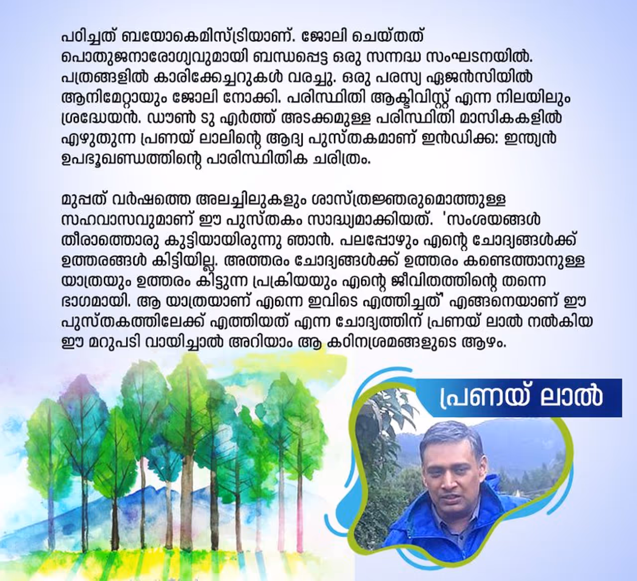 ദിനോസറുകളും ഭീകരന്മാരായ ഉരഗങ്ങളും ഭീമാകാരന്മാരായ സസ്തനികളും വിസ്മയിപ്പിക്കുന്ന സസ്യവര്ഗങ്ങളും നിറഞ്ഞുനിന്നിരുന്ന ഉപഭൂഖണ്ഡത്തിന്റെ ചരിത്രത്തെ അതീവ മനോഹരമായി അവതരിപ്പിക്കുന്നതാണ് ഇന്ഡിക: ഇന്ത്യന് ഉപഭൂഖണ്ഡത്തിന്റെ പാരിസ്ഥിതിക ചരിത്രം എന്ന പുസ്തകം. ഇന്ത്യയുടെ ഭൂവിജ്ഞാനീയ ചരിത്രത്തെ പരിസ്ഥിതി വിജഞാനീയ ഭൂതകാലവുമായി ചേര്ത്തുപഠിക്കുകയാണ് ഈ ഗ്രന്ഥം. ഫോസില് രേഖകളുടെ സമര്ത്ഥമായ വിനിയോഗത്തിലൂടെ നമ്മുടെ ഉപഭൂഖണ്ഡത്തിന്റെ രൂപപ്പെടല് പരിശോധിക്കുന്ന ഈ പുസ്തകം ഇന്ത്യയുടെ പ്രകൃതി വിജ്ഞാനീയ ചരിത്രത്തിലെ ഏറ്റവും ശ്രദ്ധേയമായ ആഖ്യാനമായാണ് കണക്കാക്കുന്നത്.