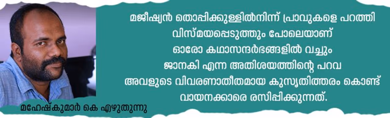 മജീഷ്യൻ തൊപ്പിക്കുള്ളിൽനിന്ന് പ്രാവുകളെ പറത്തി വിസ്മയപ്പെടുത്തും പോലെയാണ് ഓരോ കഥാസന്ദർഭങ്ങളിൽ വച്ചും ജാനകി എന്ന അതിശയത്തിന്റെ പറവ അവളുടെ വിവരണാതീതമായ കുസൃതിത്തരം കൊണ്ട് വായനക്കാരെ രസിപ്പിക്കുന്നത്. ആ രസച്ചരടിൽ ജാനകി കുടുക്കിയെടുക്കുന്നത് അവളുടെ കൂട്ടുകാരായ കുട്ടപ്പനെയും കിങ്ങിണിയെയും അവരുടെ അമ്മയെയും അച്ഛനെയും മുത്തശ്ശിയെയും മാത്രമല്ല, എല്ലാ വായനക്കാരെയുമാണ്. മഴയുടെയും കാറ്റിന്റെയും പക്ഷിമൃഗാദികളുടെയും ഭാഷ സംസാരിക്കുന്ന അമ്മയുടെ കഥാപാത്രം പ്രപഞ്ചത്തിൽ കുടികൊള്ളുന്ന സ്നേഹത്തിന്റെ മാനുഷികരൂപമാണ്. ചുറ്റിലുമുള്ള ജീവജാലങ്ങളോട് സാധാരണ മനുഷ്യരോടെന്നപോലെ അമ്മ സംസാരിക്കുന്നത് കണ്ട് അതിശയപ്പെടുന്ന മകനോട് അവർ പറയുന്നത് 'പ്രകൃതിയുടെ പിന്നാലെ കൂടിയാൽ അത് നമ്മളോട് സാവധാനത്തിൽ സംസാരിച്ച് തുടങ്ങുമെന്നും പ്രകൃതിയുമായുള്ള സൗഹൃദം കൊണ്ട് മാത്രമേ ആ ഭാഷ പൂർണ്ണമായും പഠിച്ചെടുക്കാൻ കഴിയുകയുള്ളൂ' എന്നുമാണ്.