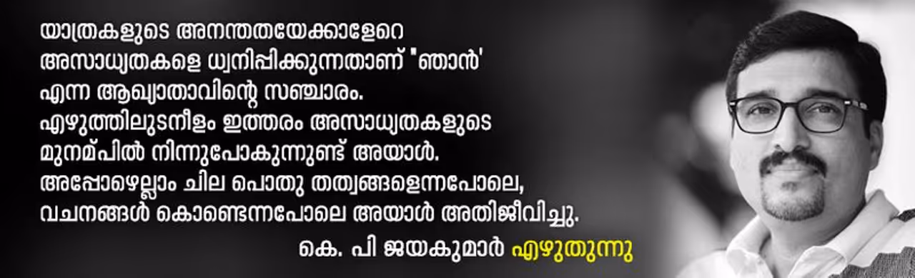 'ഞാന്' എന്ന ആഖ്യാതാവ് യാത്രയുടെ തുടക്കമോ ഒടുക്കമോ അല്ല, തുടര്ച്ചയാണ്. കെകെസിയുടെ മരക്കടയില് തടികളുടെ കണ്ടിക്കണക്കെഴുതിയിരുന്ന 'ഞാന്' കിളിമഞ്ജാരോ ബുക്സ്റ്റാളിലെ വില്പ്പനക്കാരനായി രൂപാന്തരപ്പെടുന്നു. കാട് കടലാസാകുന്നതുപോലെ, വാക്കുകള് കാടുണ്ടാക്കുന്നതുപോലെ, പുസ്തകം കാടാകുന്നതുപോലെ, മനുഷ്യര് കഥകളും കഥകള് മനുഷ്യരുമാകുന്നതുപോലെ അവസാനിക്കാത്ത ഉപമകളുടെ പലതരം രൂപാന്തരങ്ങളും രൂപകങ്ങളുമായി 'ഞാന്' അര്ദ്ധോക്തികളുടെ അഴിഞ്ഞുതീരാത്ത ചുരം കയറുന്ന കഥാപാത്രമാണ്.