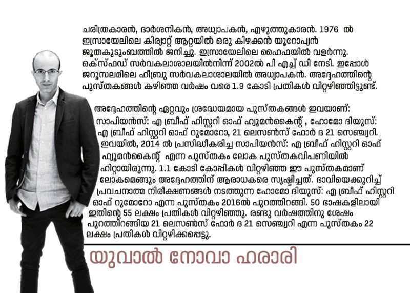 ഇന്ന് ലോകത്തേറ്റവും വായിക്കപ്പെടുന്ന എഴുത്തുകാരിലൊരാള്. ഇസ്രയേലി ചരിത്രപണ്ഡിതനും ചിന്തകനും എഴുത്തുകാരനുമായ യുവാല് നോവാ ഹരാരിയെ അങ്ങനെ വിശേഷിപ്പിക്കാം. അദ്ദേഹത്തിന്റെ തട്ടകം ചരിത്രമാണ്. അവിടെനിന്നും വിവിധ വിജ്ഞാനശാഖകളിലൂടെയും ദര്ശനങ്ങളിലൂടെയും നടത്തിയ യാത്രകളാണ് സവിശേഷമായ ആ പുസ്തകങ്ങളിലെത്തിയത്. അത് മനുഷ്യരാശിയുടെ പല തലങ്ങള് അന്വേഷിക്കുന്നു. ഭാവിയെയും ഭൂതവര്ത്തമാനങ്ങളെക്കുറിച്ചുമുള്ള അസാധാരണമായ ഉള്ക്കാഴ്ചകള്, നിരീക്ഷണങ്ങള്.