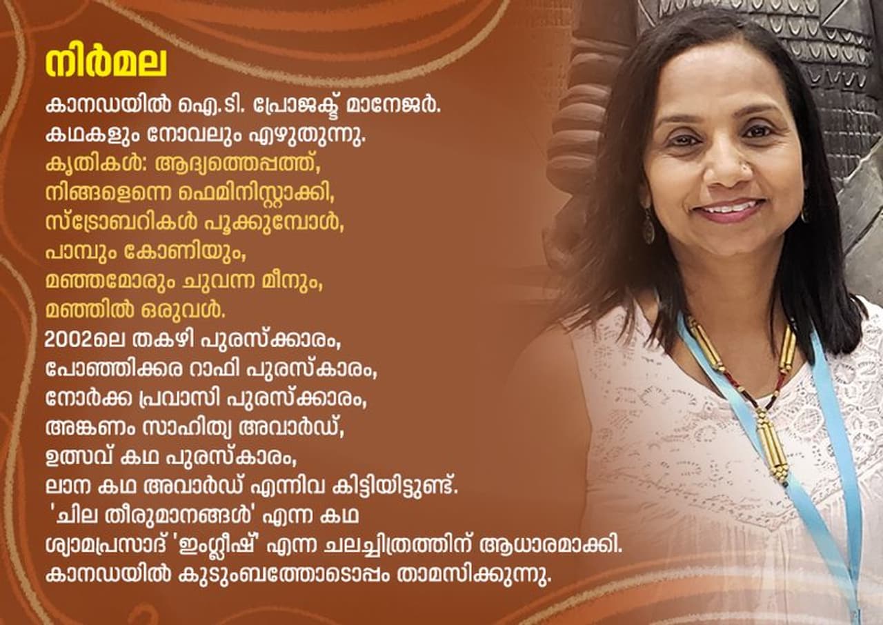 ഒരുപക്ഷേ നിര്മ്മലയുടെ നോവലില് ഉടനീളം രോഗസംഹാരിയായി പ്രവര്ത്തിക്കുന്നത് ഈ ഭാരമില്ലാത്ത ആത്മഭാഷയാണ്. സ്വയം സംസാരിക്കാനറിയുന്നവള്ക്ക് സ്വന്തം മുറിവുണക്കാനുമാകും എന്നാവാം നിര്മ്മല നമ്മോടു പറയുന്നത്. അതാണ് ഈ നോവലിന്റെ ഫെമിനിസ്റ്റ് കാതല് - ഇലയിലോ പൂവിലോ കണ്ടെന്നുവരില്ല, പക്ഷേ അതു തന്നെയാണ് ഈ ആഖ്യാനത്തിന്റെ തായ്ത്തടി.